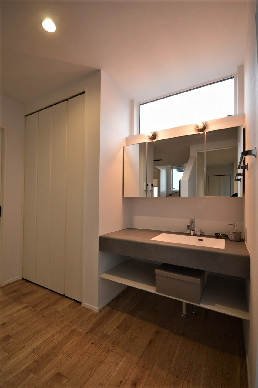 延べ床面積31坪ながら、20.8帖のLDKに加え、下屋を利用したリビングの勾配天井、洗面スペースへの視線の抜け、リビング階段の開放により、コンパクトでも開放的な住まいに。