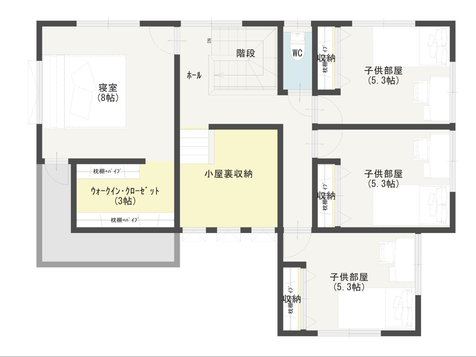2階には子供部屋を3つ設け、それぞれが独立した空間を持てるよう設計。収納スペースは壁面を活用することで、限られたスペースの中でもすっきりと片付き、部屋を広く使える工夫が施されています。