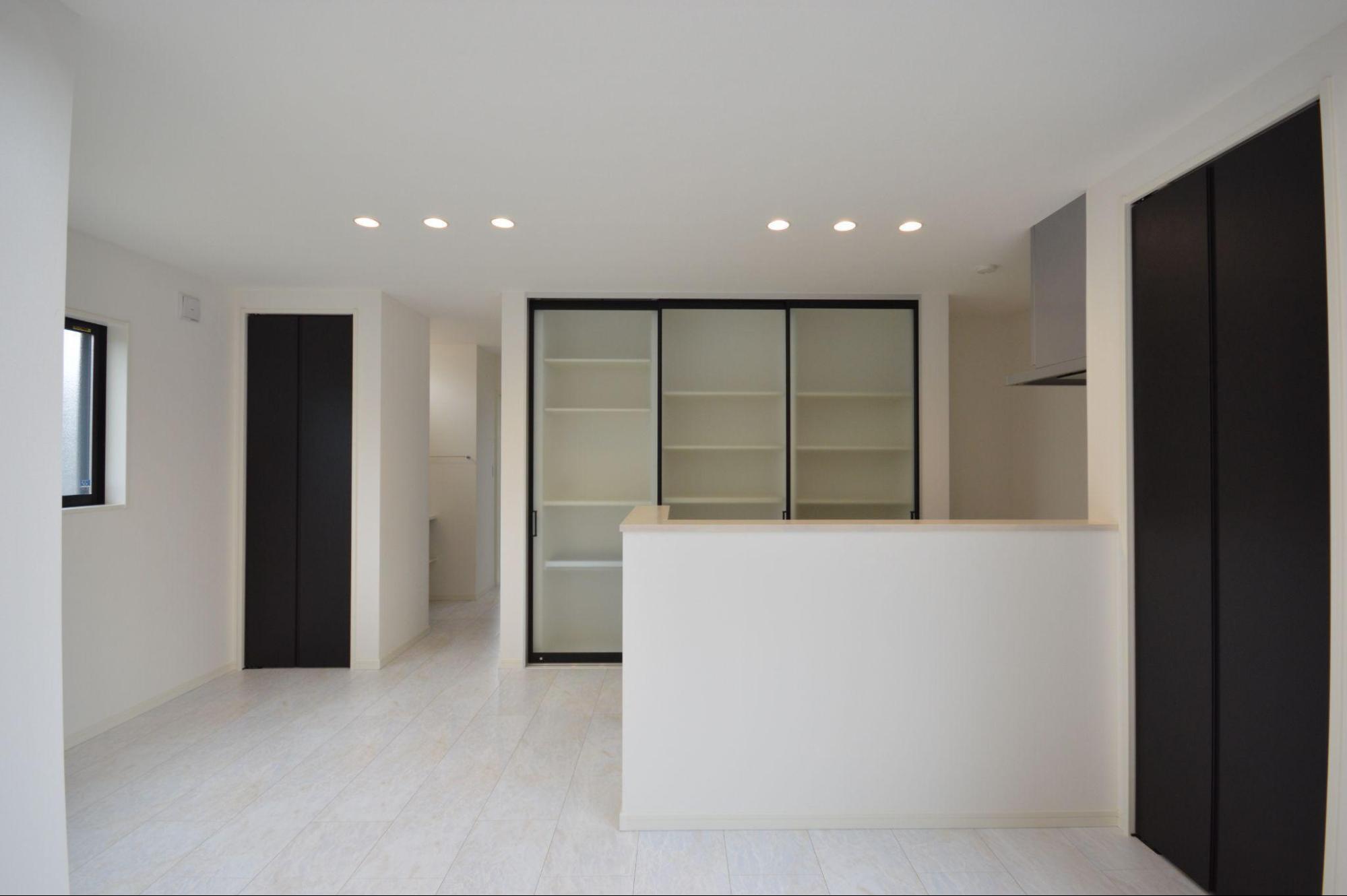 キッチンの食器棚には生活感を隠すため全て建具を取り入れ、水回りへの動線を確保しました。