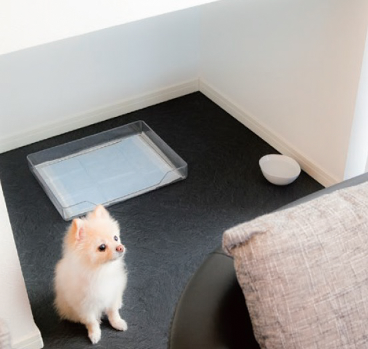 まず、こちらの事例は広々としたリビングが特徴の住まいです。室内でくらす愛犬のための専用トイレスペースと、滑りにくい床材を備え、愛犬を一緒に過ごせる環境を整えました。また、愛犬が自由に遊べる広いスペースも確保。こうした配慮によって、家族と愛犬が長く共に幸せな時間を楽しめる空間となっています。