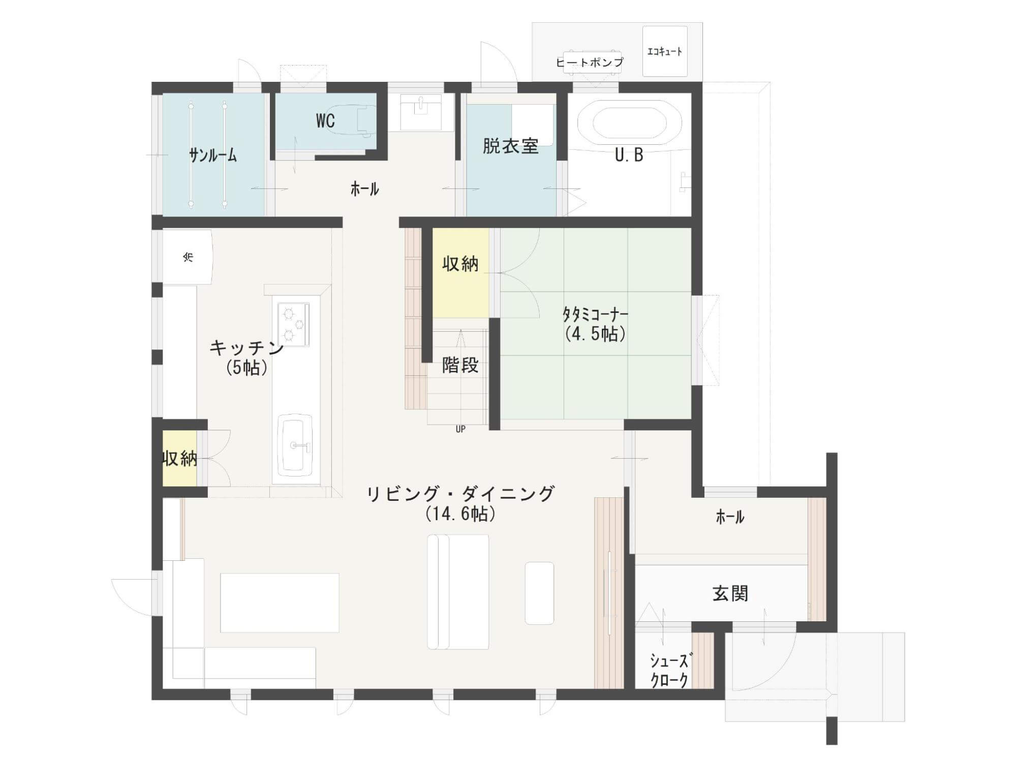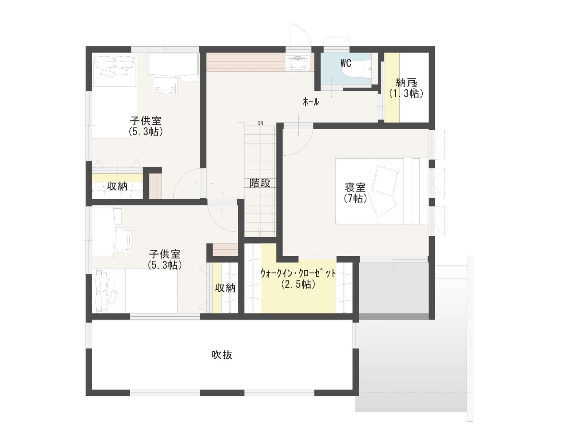 吹抜けのある空間では、一般的には冷えやすい傾向にある1階床面に対しても有効です。床暖房なら、LDKから和室、廊下、洗面所・トイレまで家中がぽかぽか。暖かい空気が吹き抜けを通って、家全体に広がります。