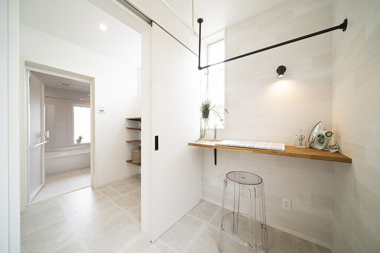 ランドリールームの場合、どの位置に洗濯機や物干しパイプを置くかによって、家事効率が変わります。