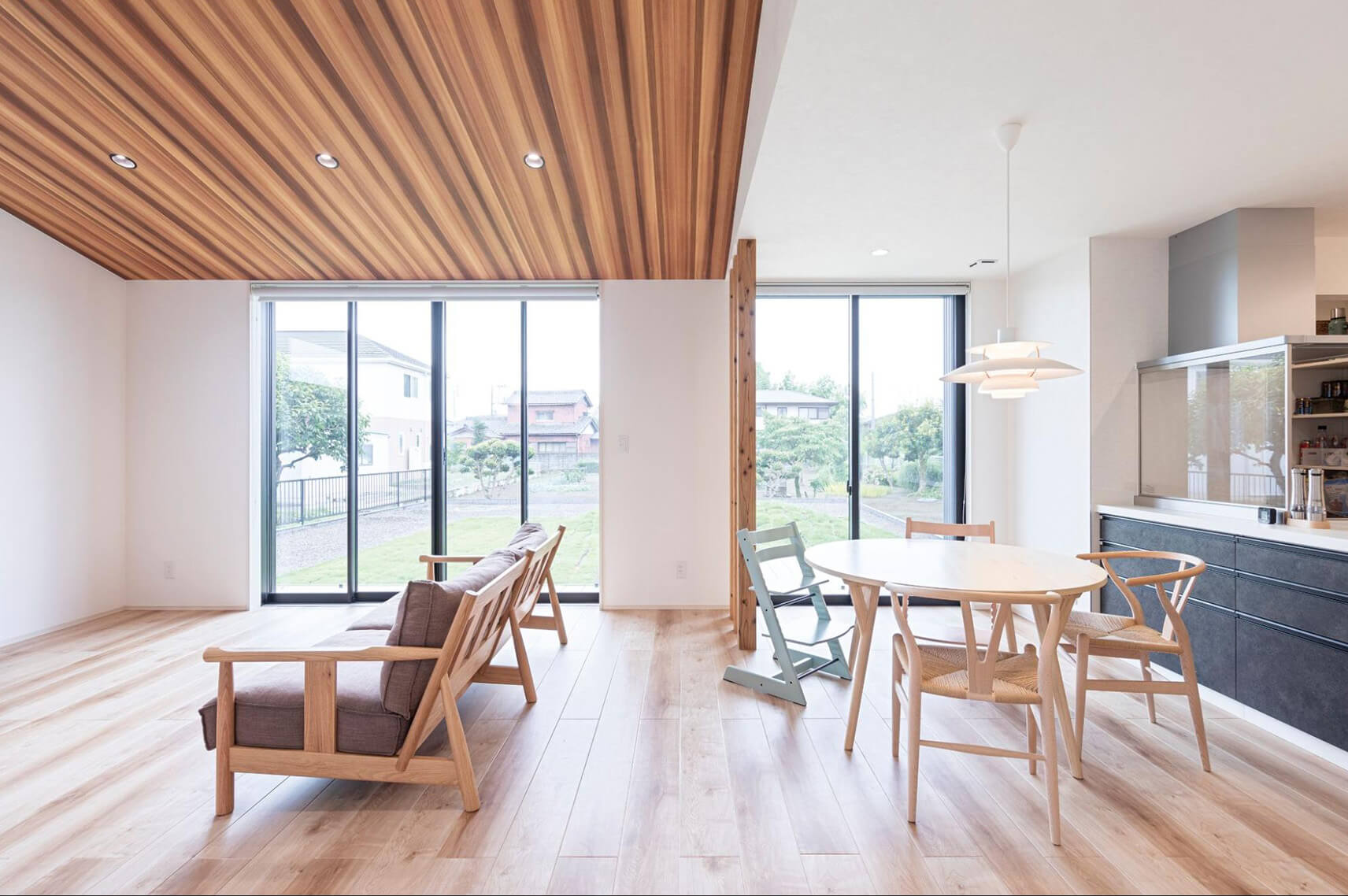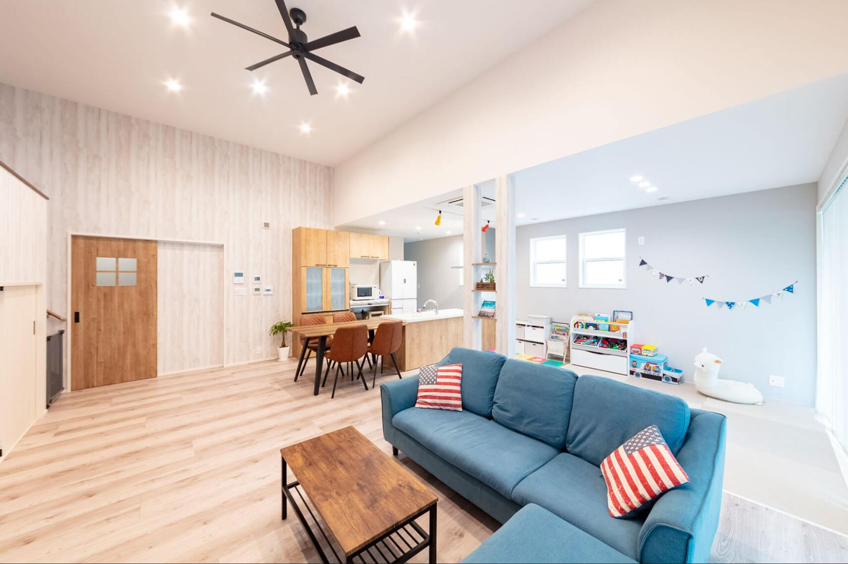 LDKは和室も組み込み、広々としたくつろぎ空間を実現。屋根の高い部分を利用してスキップフロアも用意し、誰もが心地良く過ごせる空間にしました。