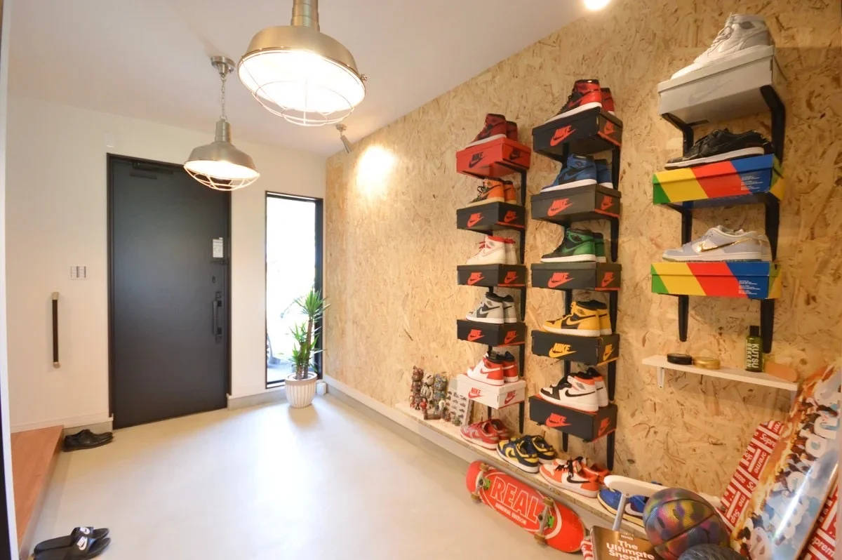 こちらの事例は4LDKではありませんが、玄関を広く取り、ギャラリールームのような土間スペースを備えた家です。玄関に入ると、まず目を引くのは広々とした土間スペース。DIYや趣味を楽しむ場所として活用でき、施主様のスニーカーやスケートボードなどのアイテムもディスプレイされています。