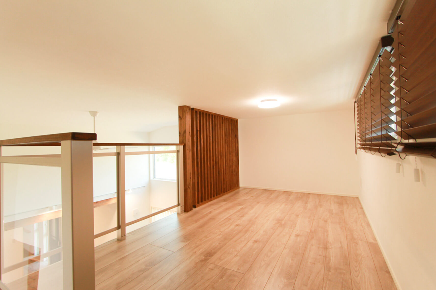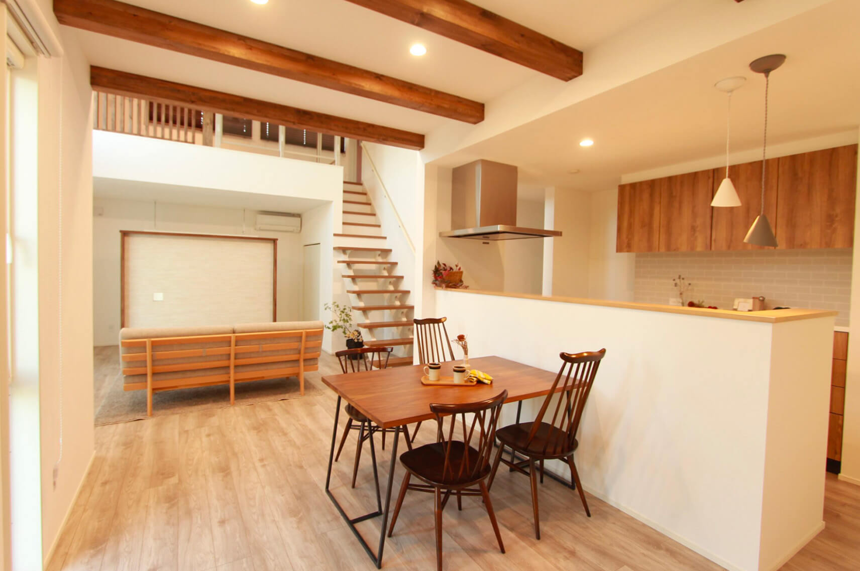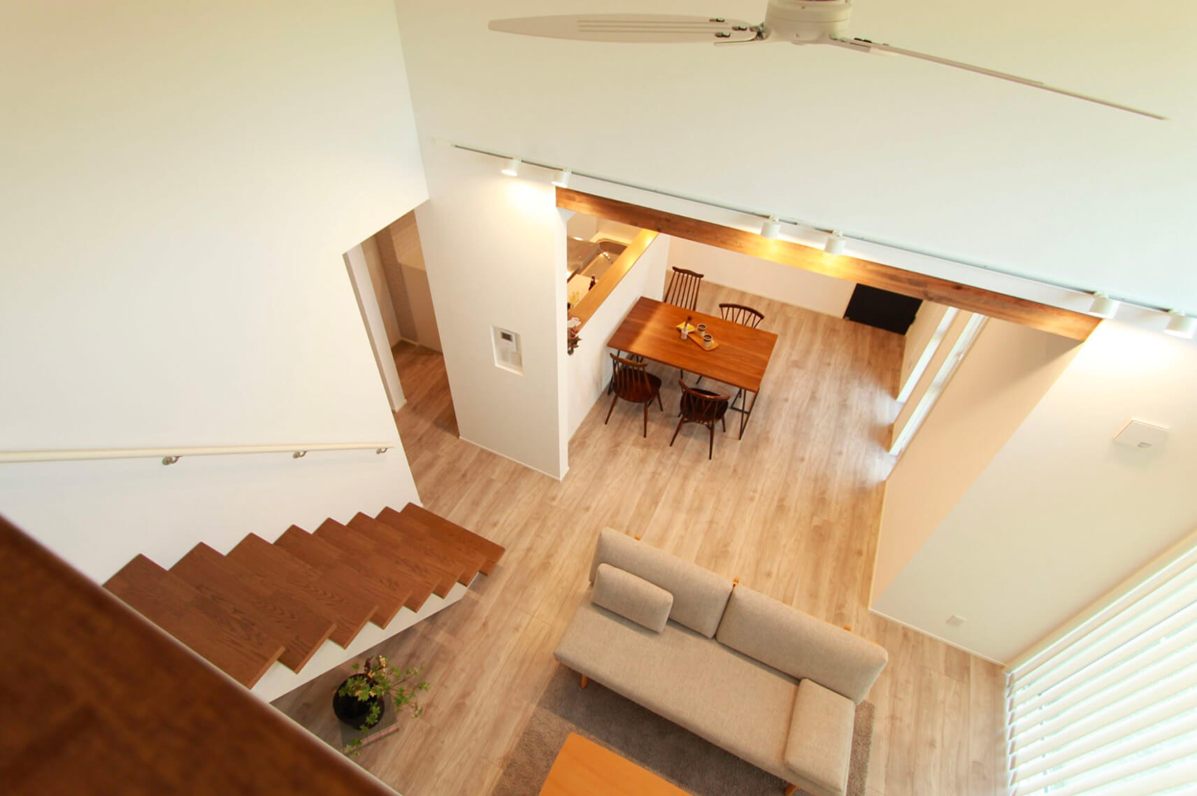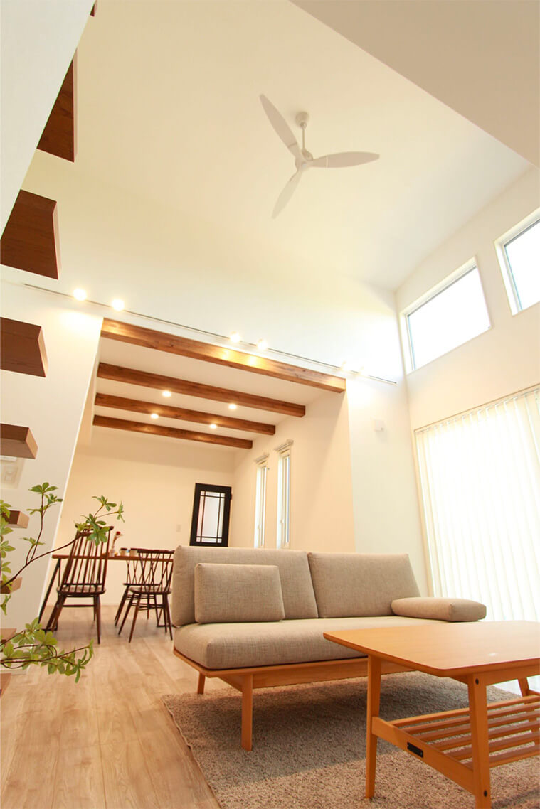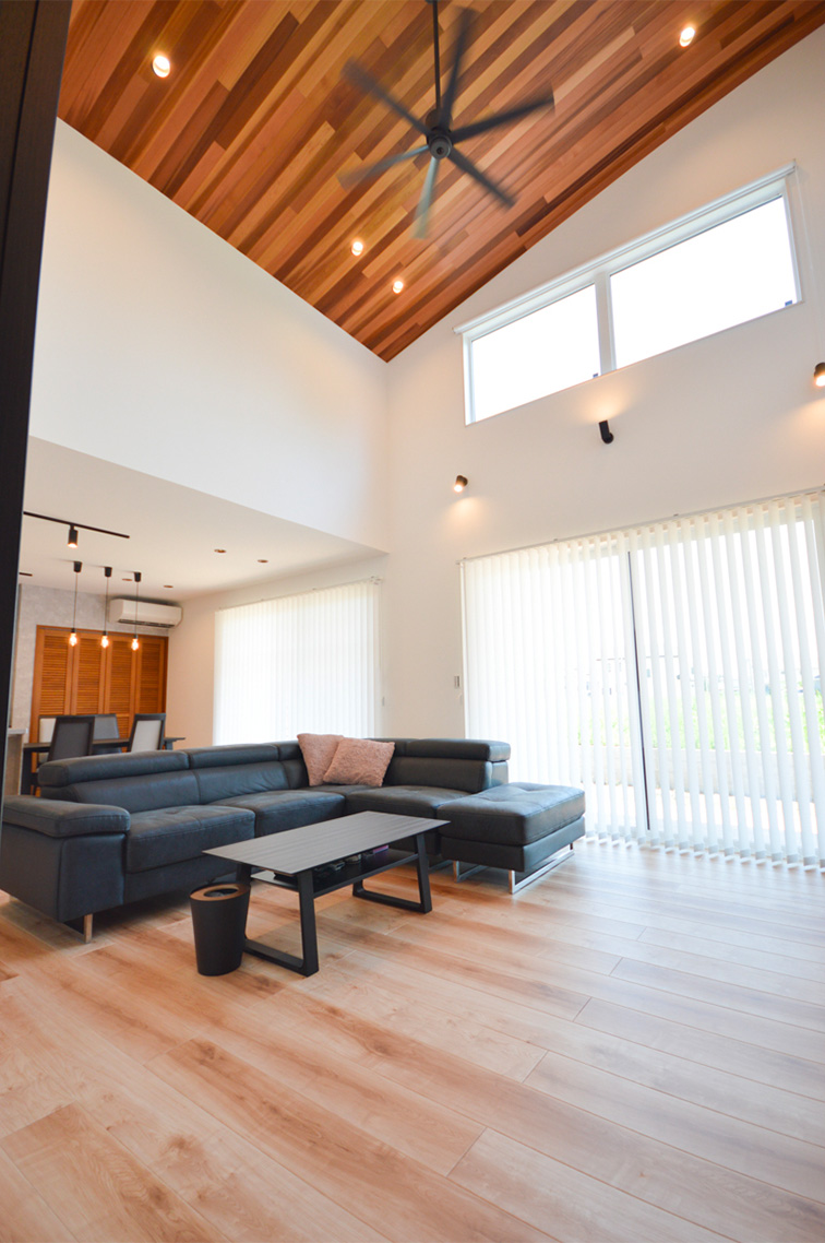 平屋は構造的に天井を高く取りやすいのが特長です。そこでステーツでは、勾配天井や高天井を採用し、縦の空間を活かすことで実際の広さ以上の開放感を演出しています。