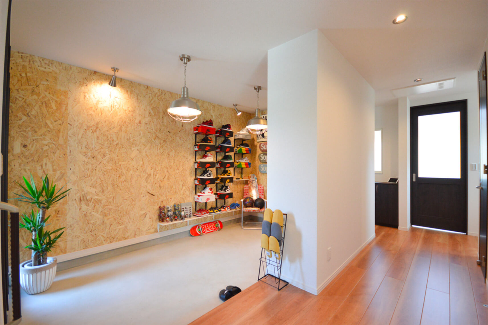 玄関から繋がる広い土間スペースには、趣味の道具をディスプレイできるギャラリースペースがあり、その奥には家族用の玄関動線と水回りが配置されています。