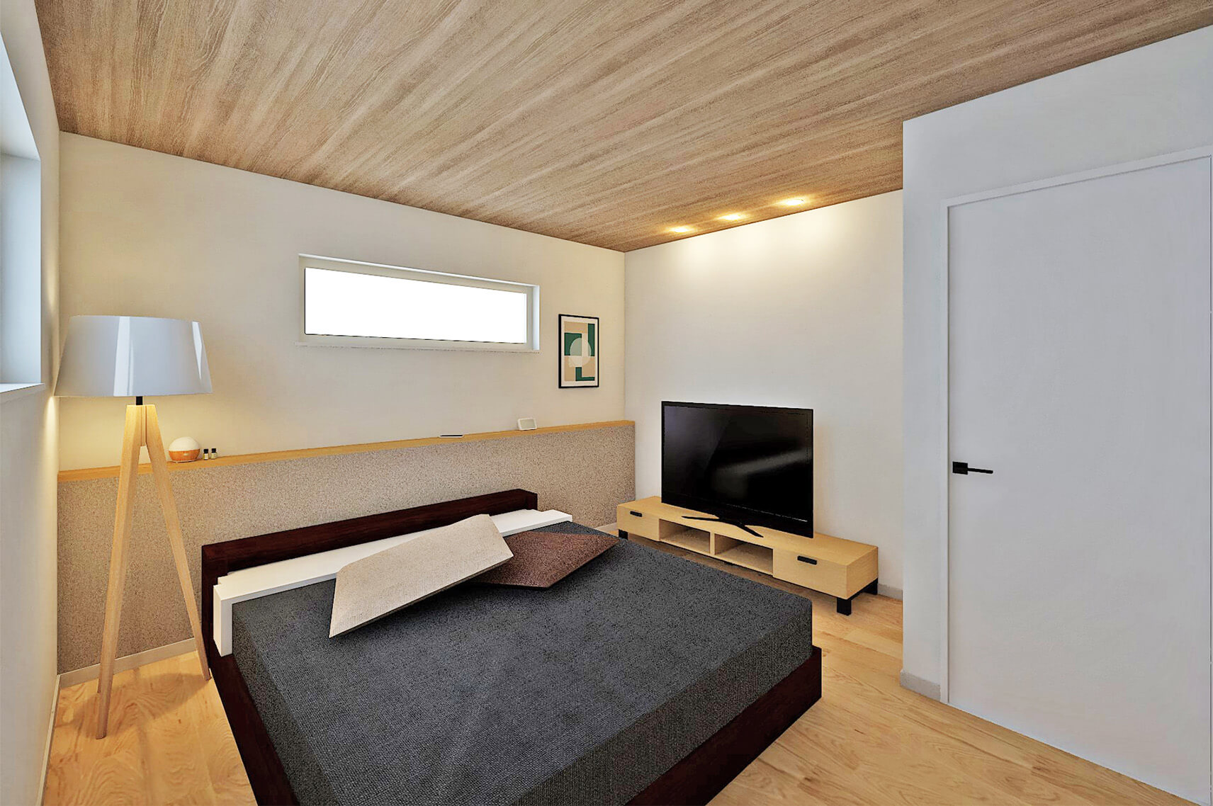 リビングに子供の個室が隣接していますが、プライバシーに配慮しているのも特徴です。また、高い天井と壁面上部に設置された窓を活用して、明るく開放的な空間を演出しています。