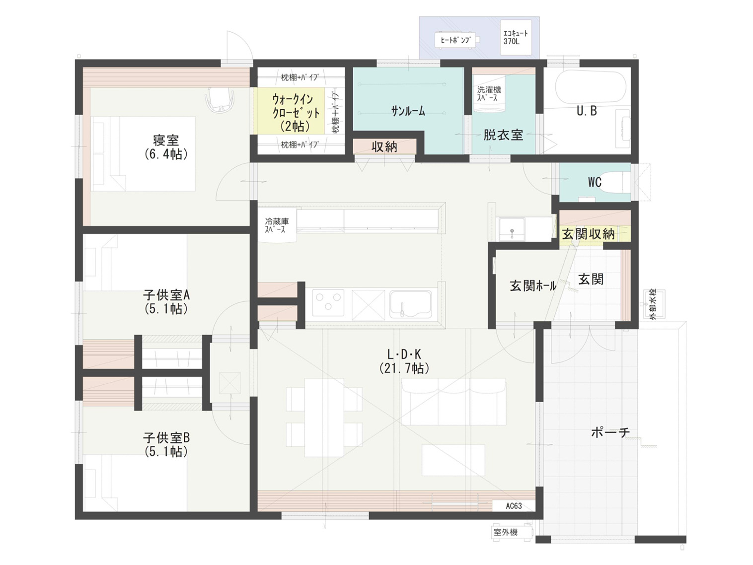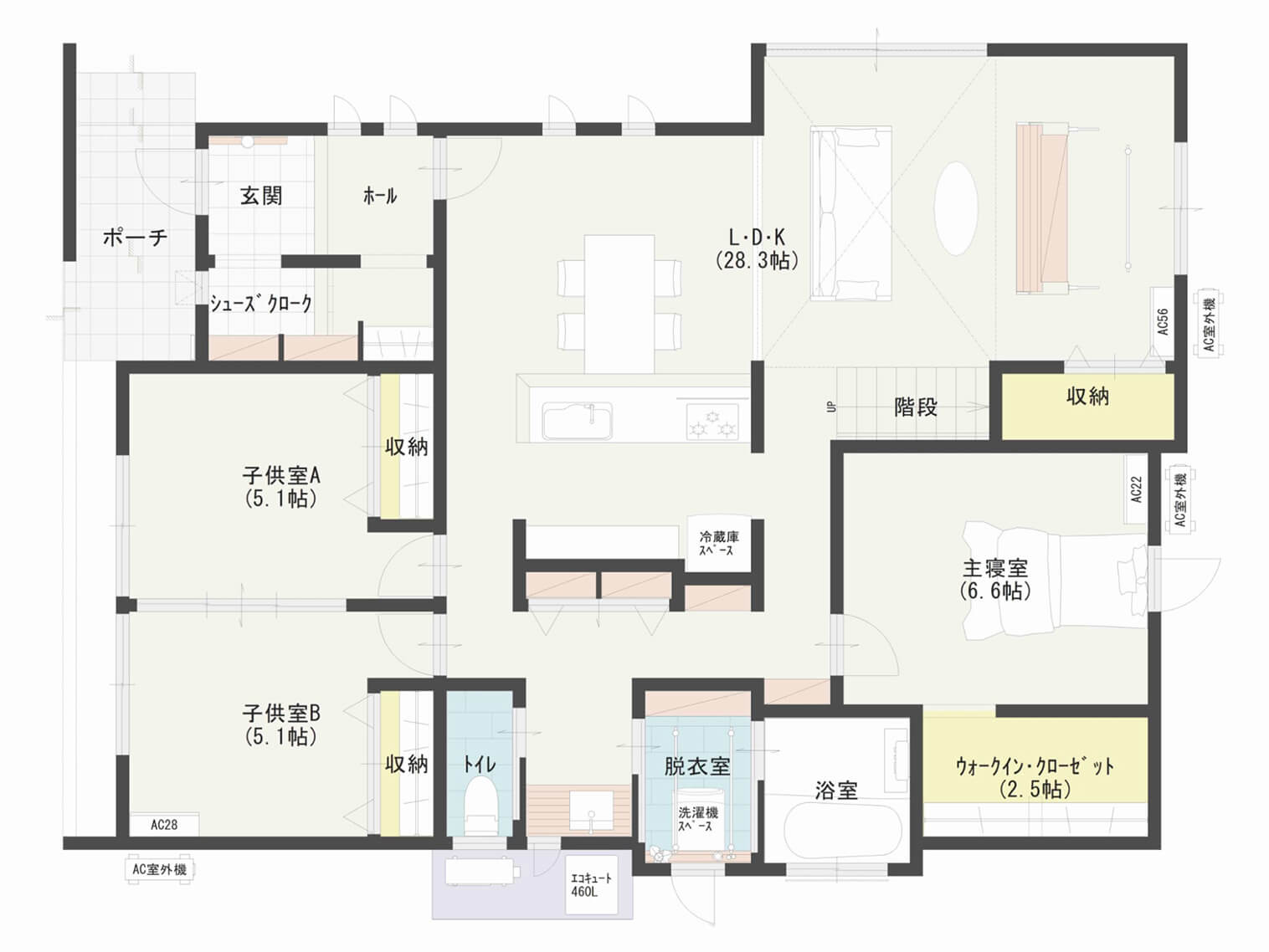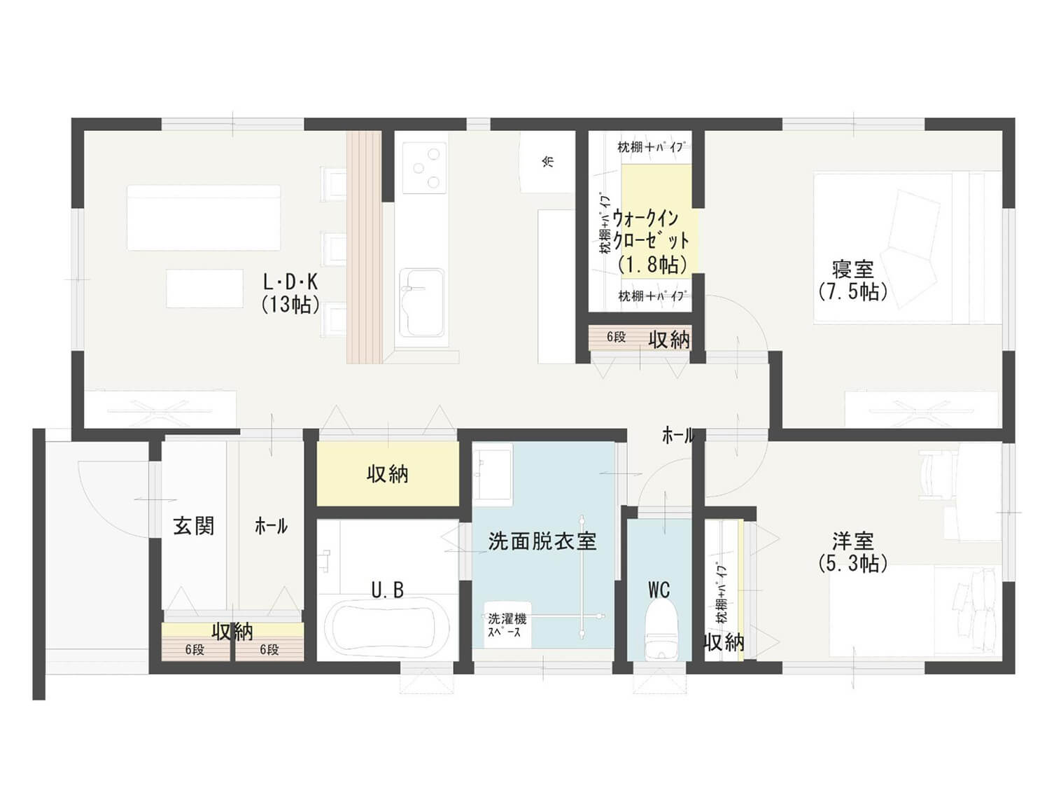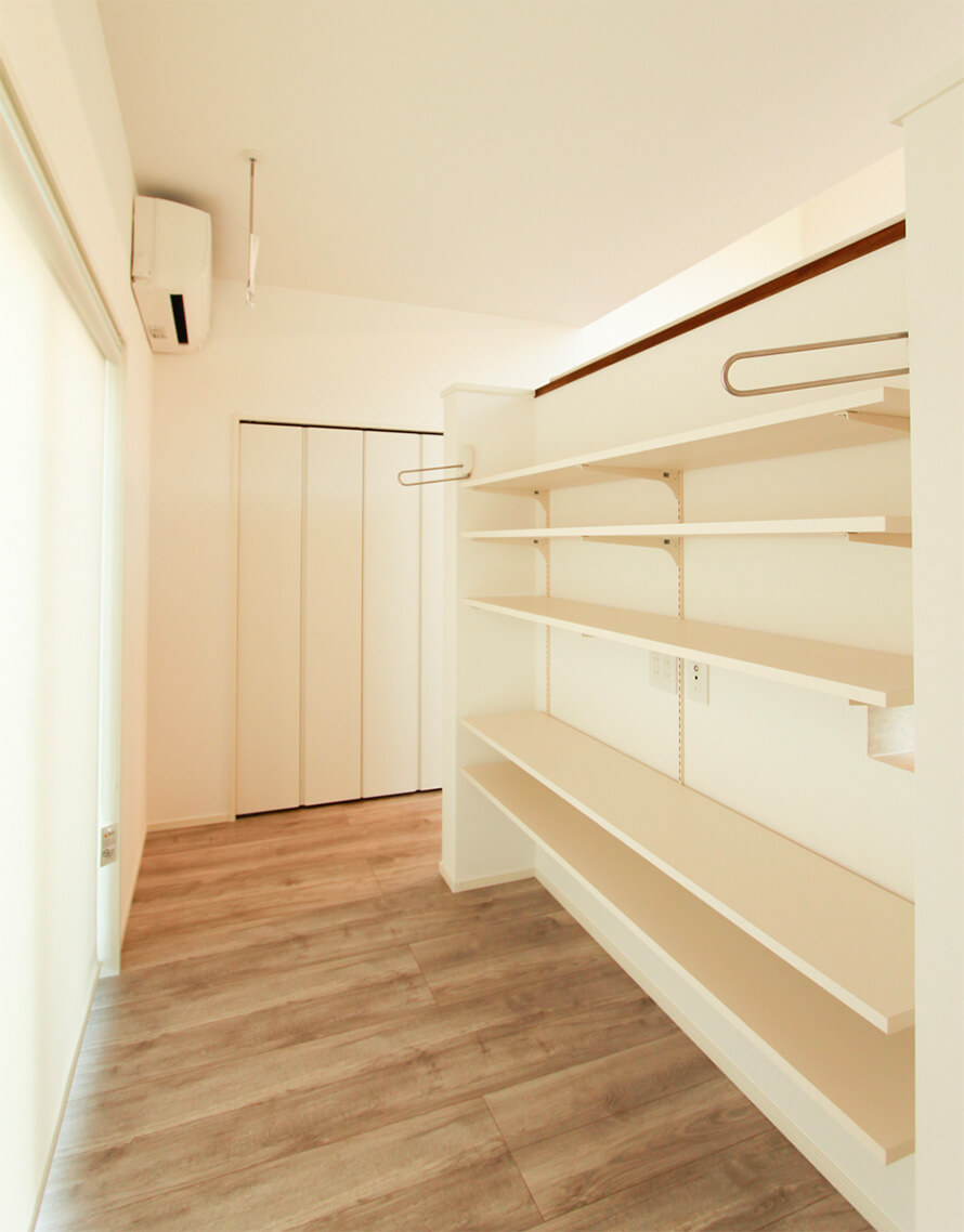 個室にしっかり収納を取りつつ、キッチン裏に食品庫としての棚収納、リビングに大容量の収納スペースを確保しています。