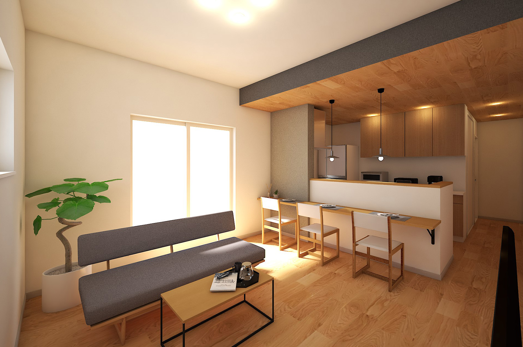 夫婦+1人の3人暮らしの構成を想定した2LDKの間取りプランです。コンパクトにまとめるためにダイニングはカウンターダイニングに。LDKの天井高を2.7mとしたことで、13帖とは感じない開放感が実現しました。