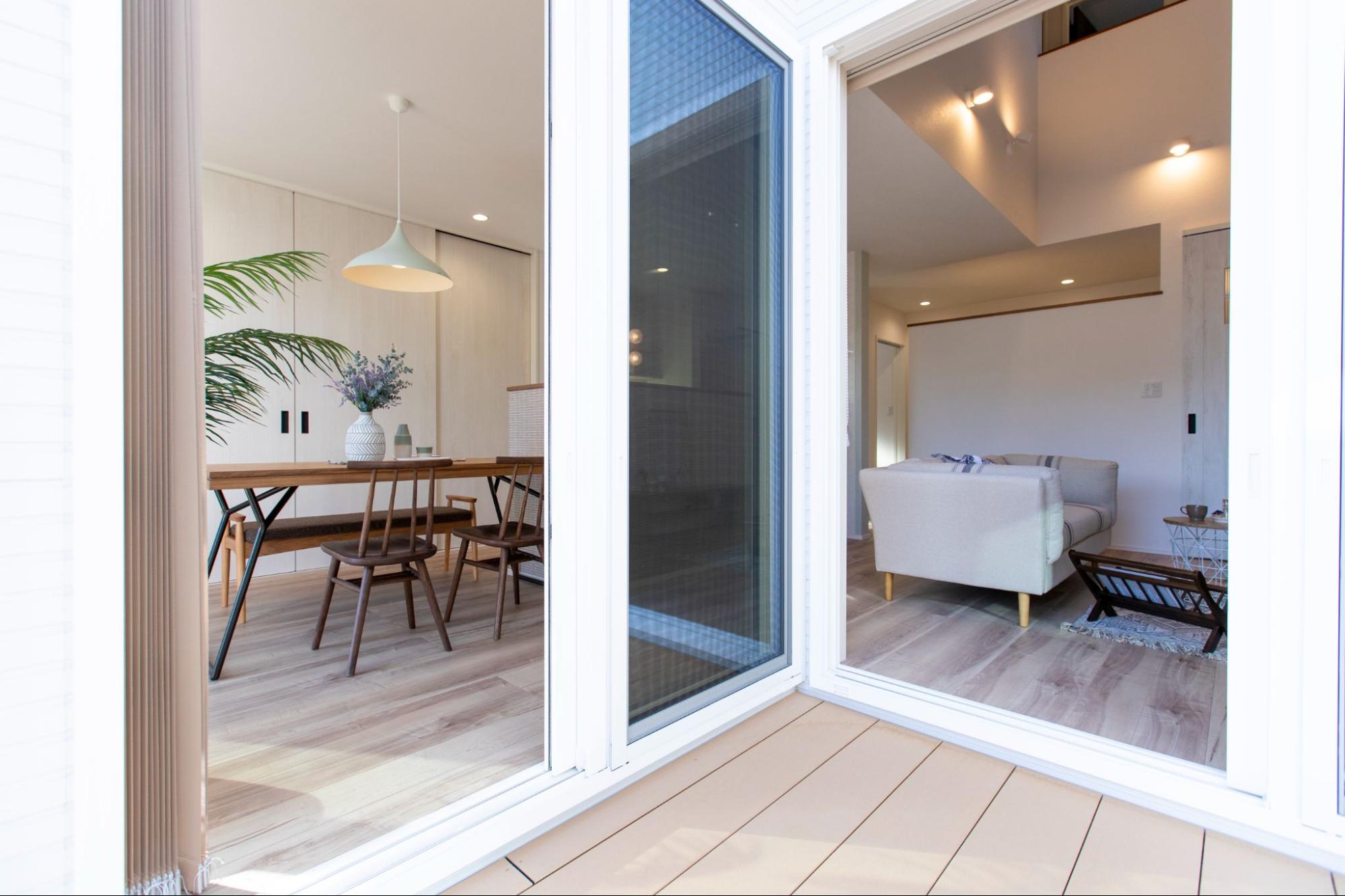 リビングから繋がるテラスの床はウッドデッキを採用しています。