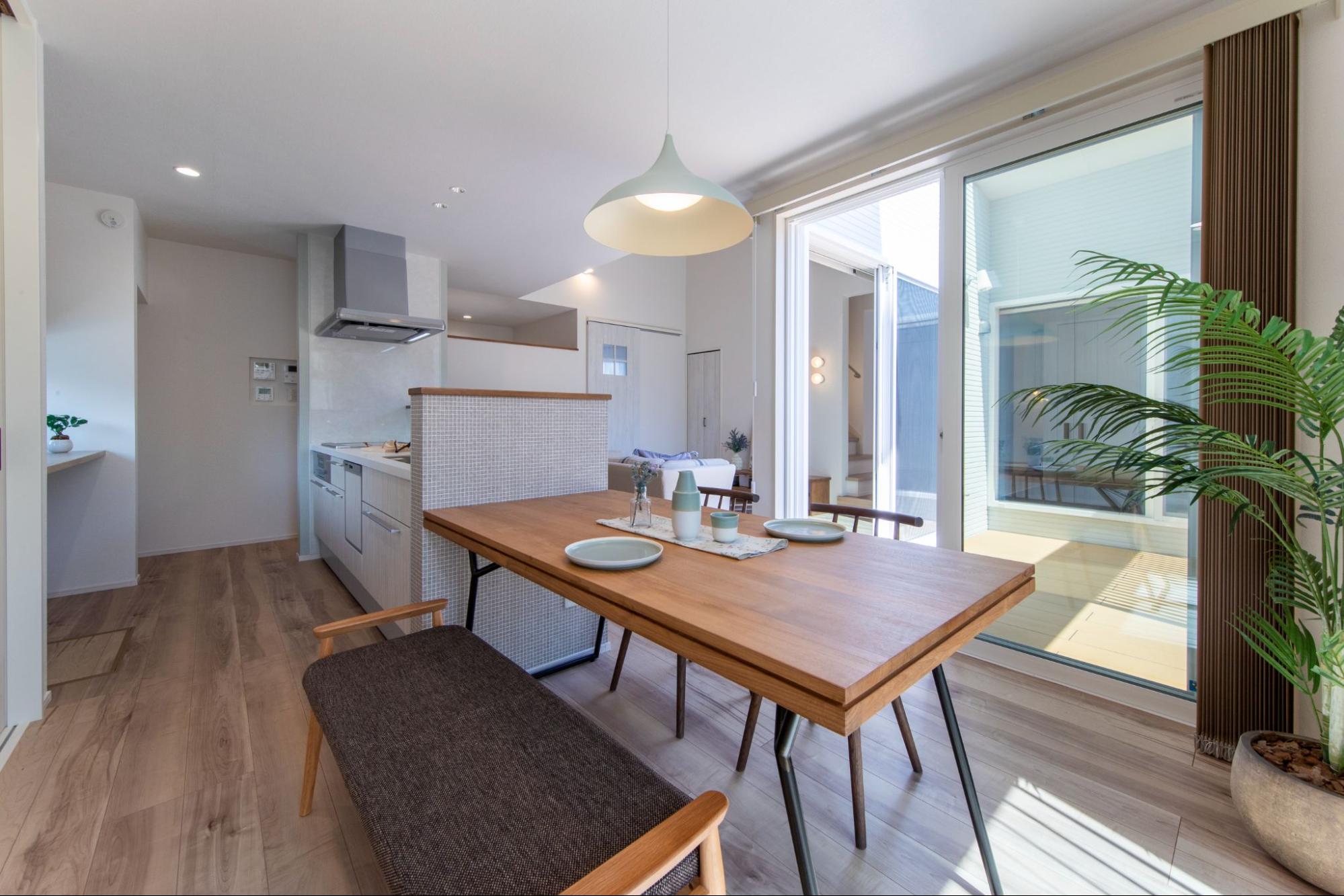 リビング・ダイニング・和室から中庭に窓があるのが特徴的。LDKそれぞれの繋がりを活かしながら、家の中に光を取り込めます。