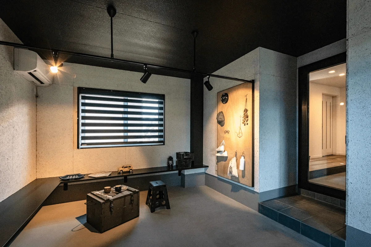 車庫スペース横に土間のラウンジスペースを設置。冬場も屋内で過ごせる空間として、雪かき道具なども収納できます。