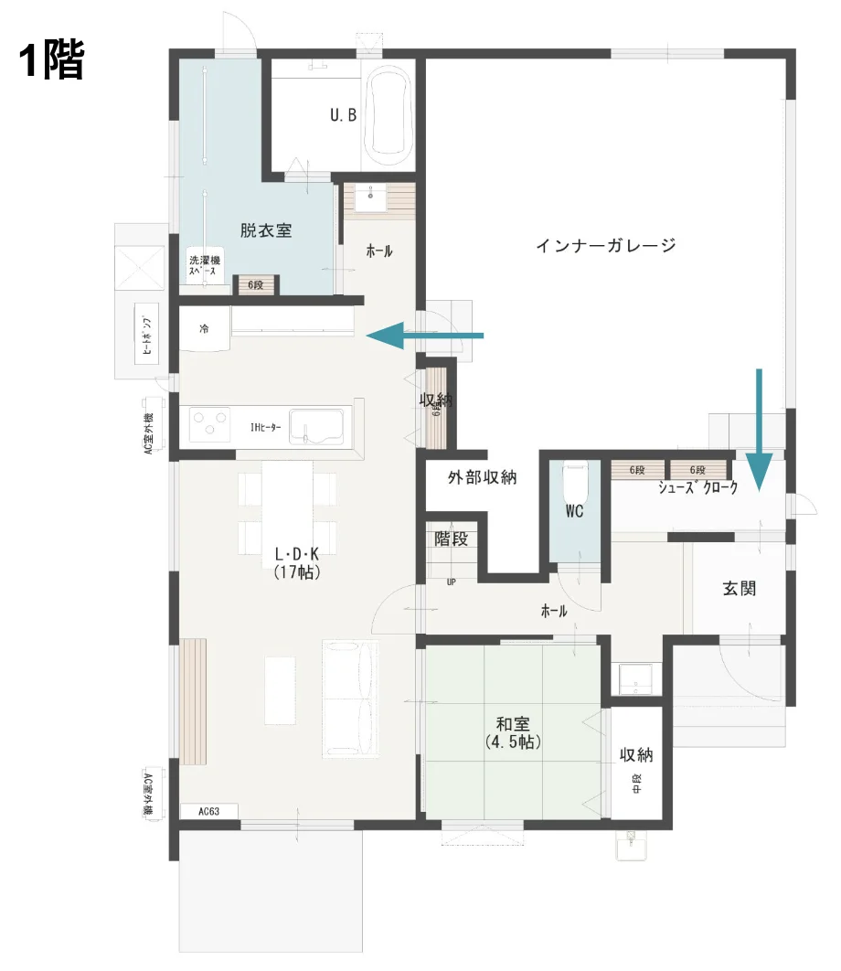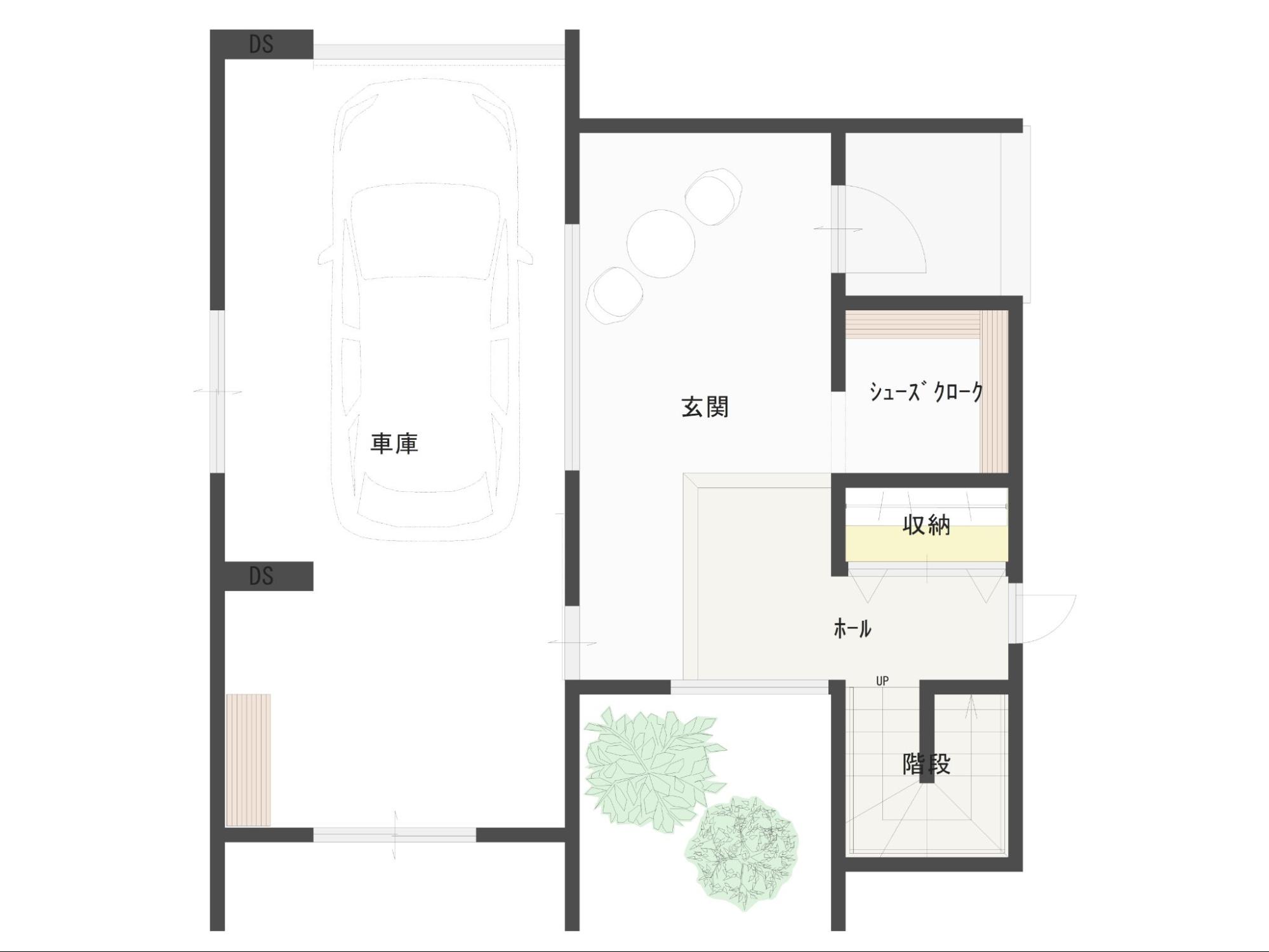 1.玄関動線::ガレージからシューズクロークを経由して玄関へ入る動線です。来客用とは別に、家族専用の動線を確保できます。