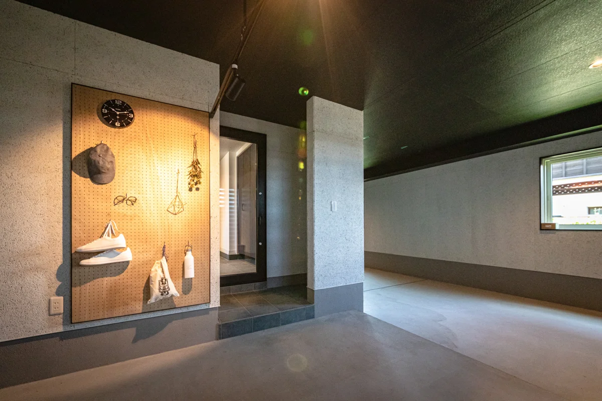 ラウンジスペースの反対側にはピロティ空間を設け、使用頻度が低い物やディスプレイスペースとして活用できます。給湯器も設置し、雪対策にも役立てています。