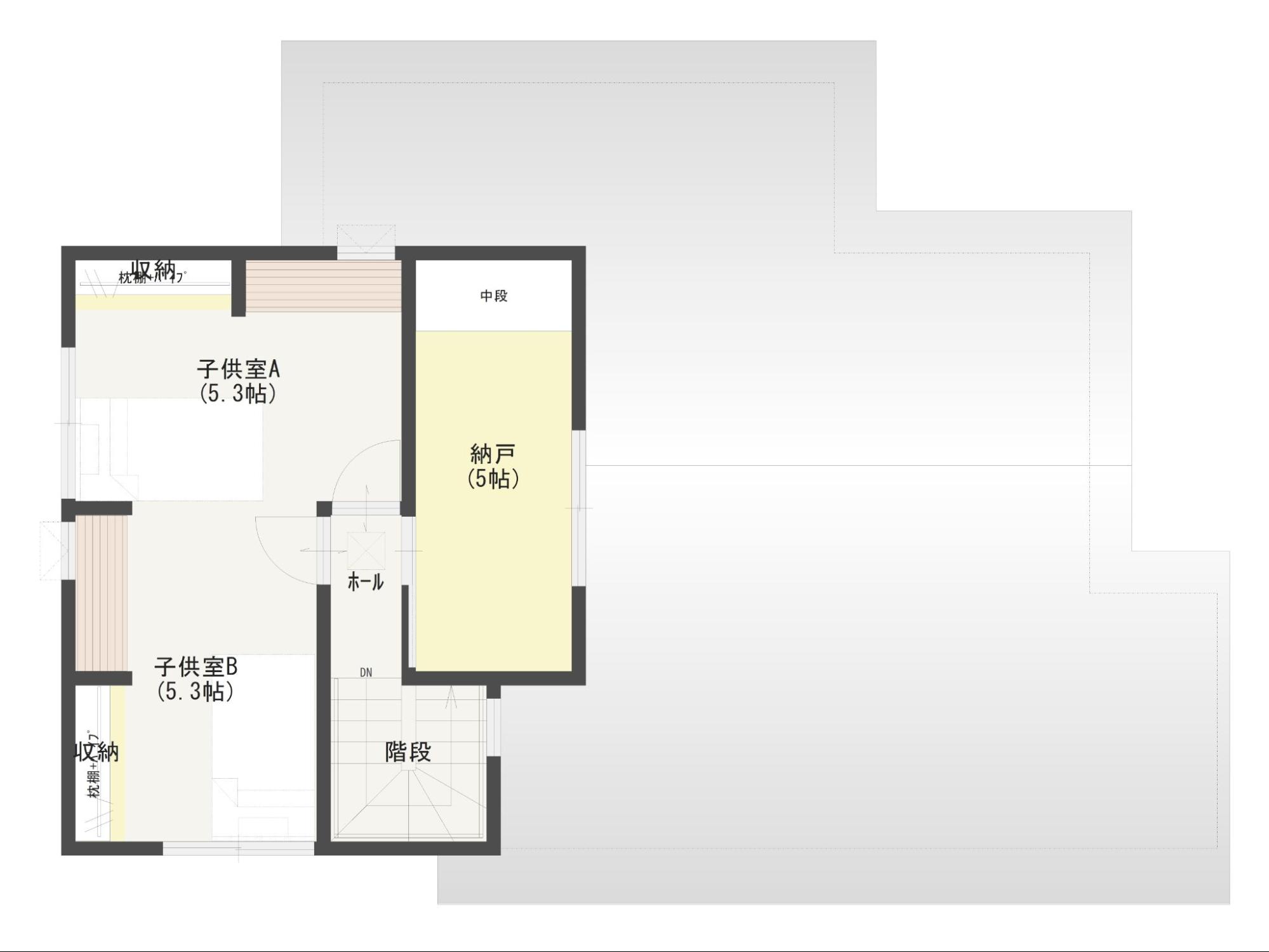 この事例は、2階に寝室と2室分の子供部屋を設けつつ、子供部屋は4.5帖というコンパクトな空間に収納×2室を設けることで、収納箇所を豊富に確保した間取りです。
