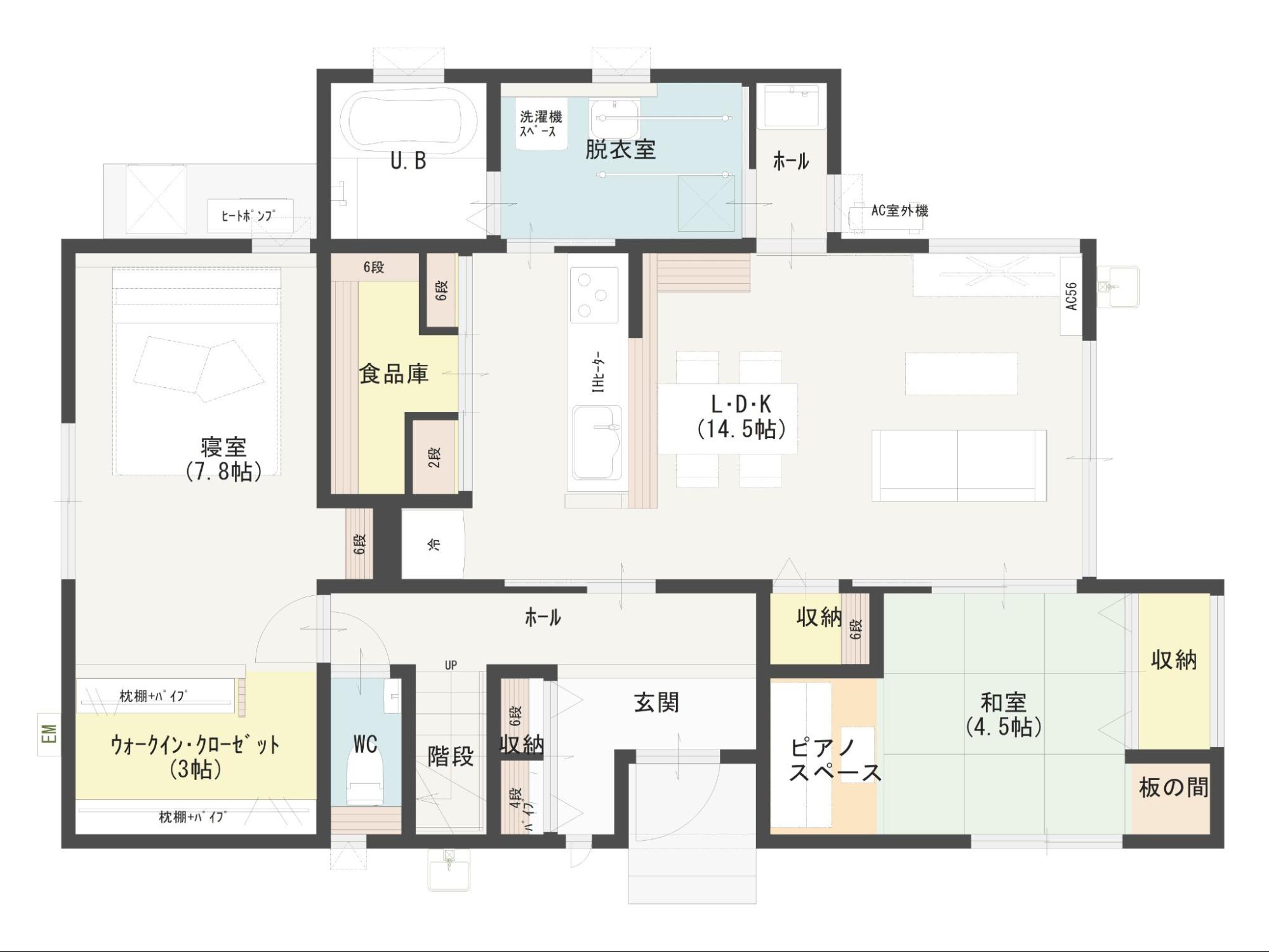 寝室、キッチン、リビング、洗面室などが1階にまとまっているため、家事動線が短くなり効率化されます。小さな子供を抱っこしながらの移動の負担が少なくなり、安全面も安心です。