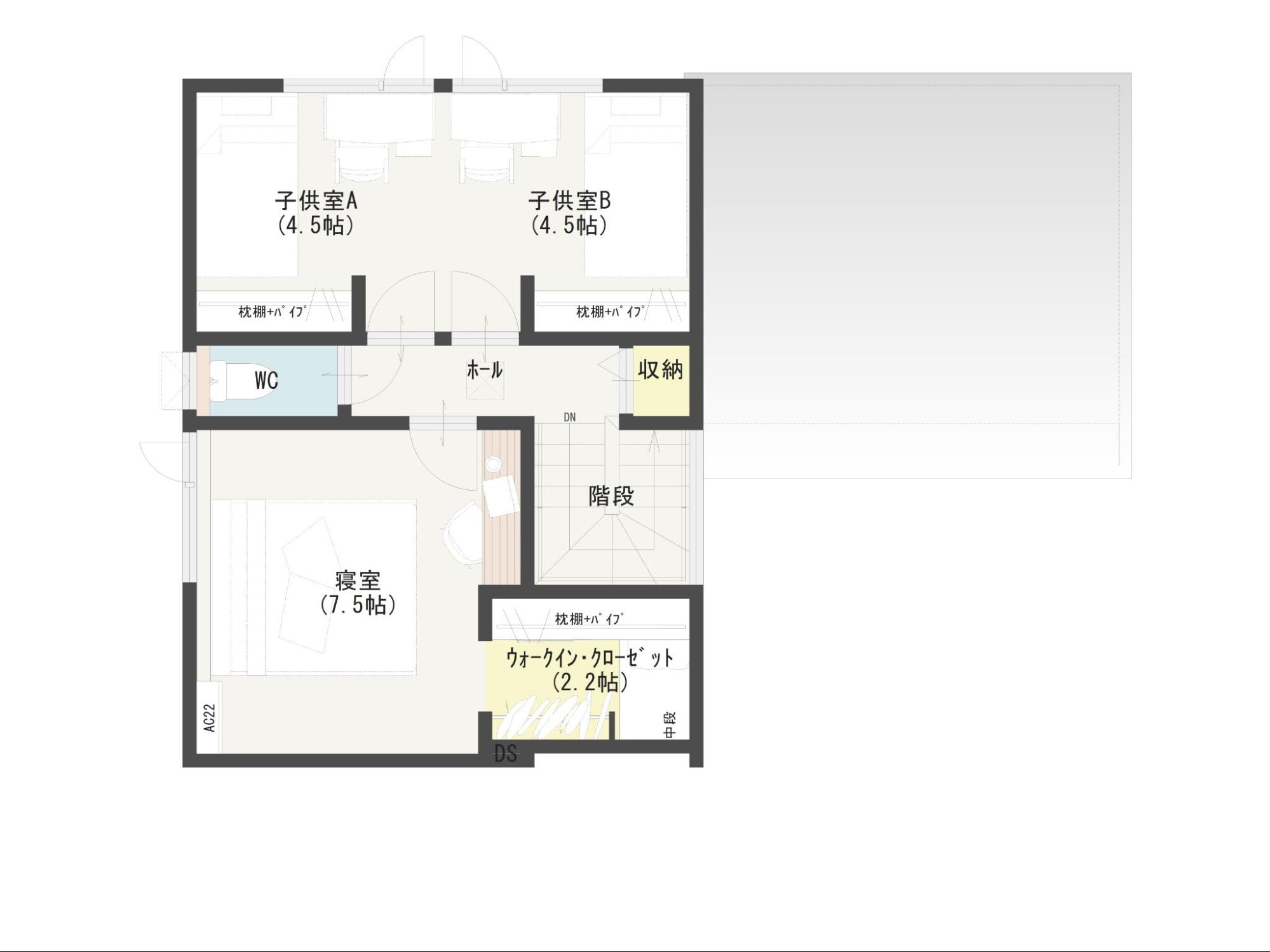 また、廊下を無くし、最低限のホールの広さのみを確保。寝室や子ども部屋など、日常的に使用する場所ができるだけ広くなる間取りを設定しています。