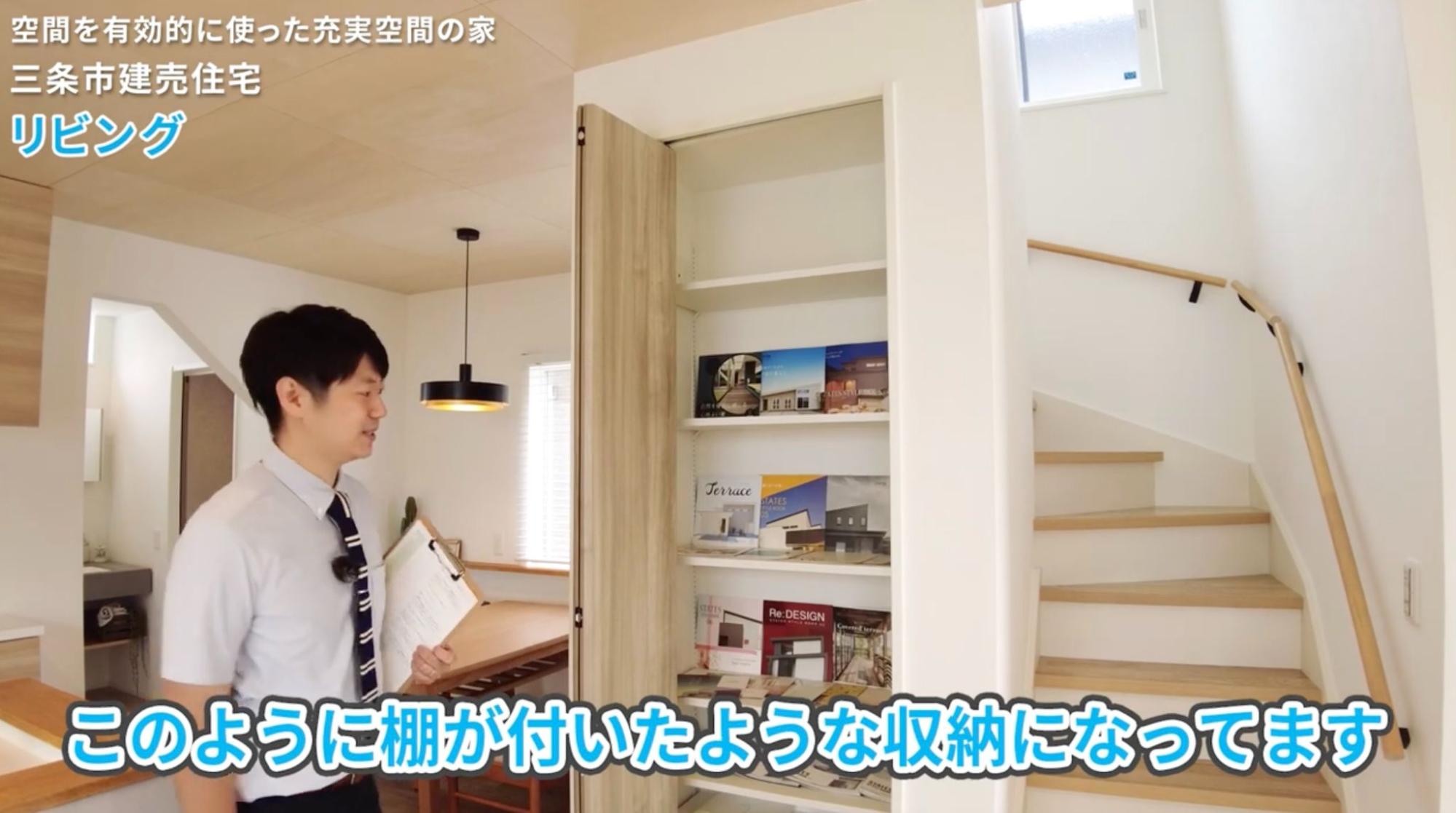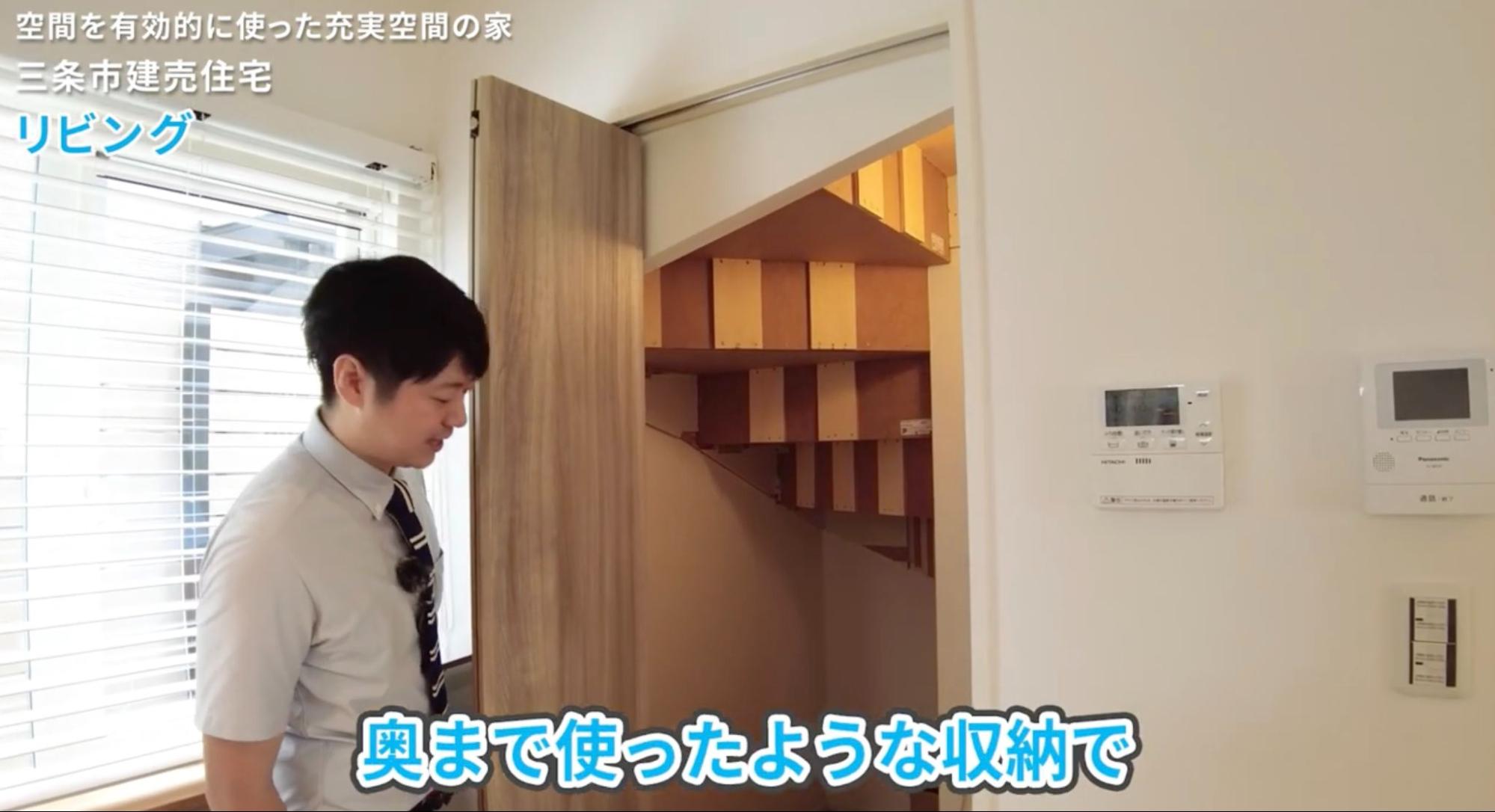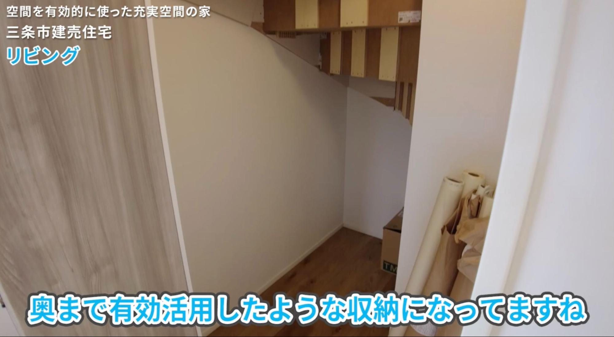 2つ目は階段下のデッドスペースを奥まで使える収納です。掃除用具やトイレットペーパーなどのストックをまとめてしまっておける空間になっています。階段下なので、高さは制限されますが、奥の奥まで有効活用できる点が特徴です。