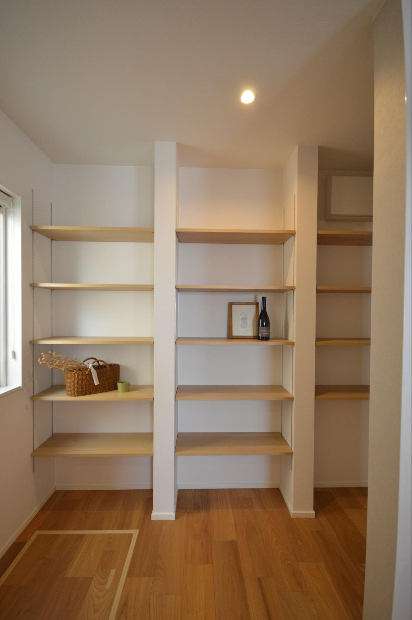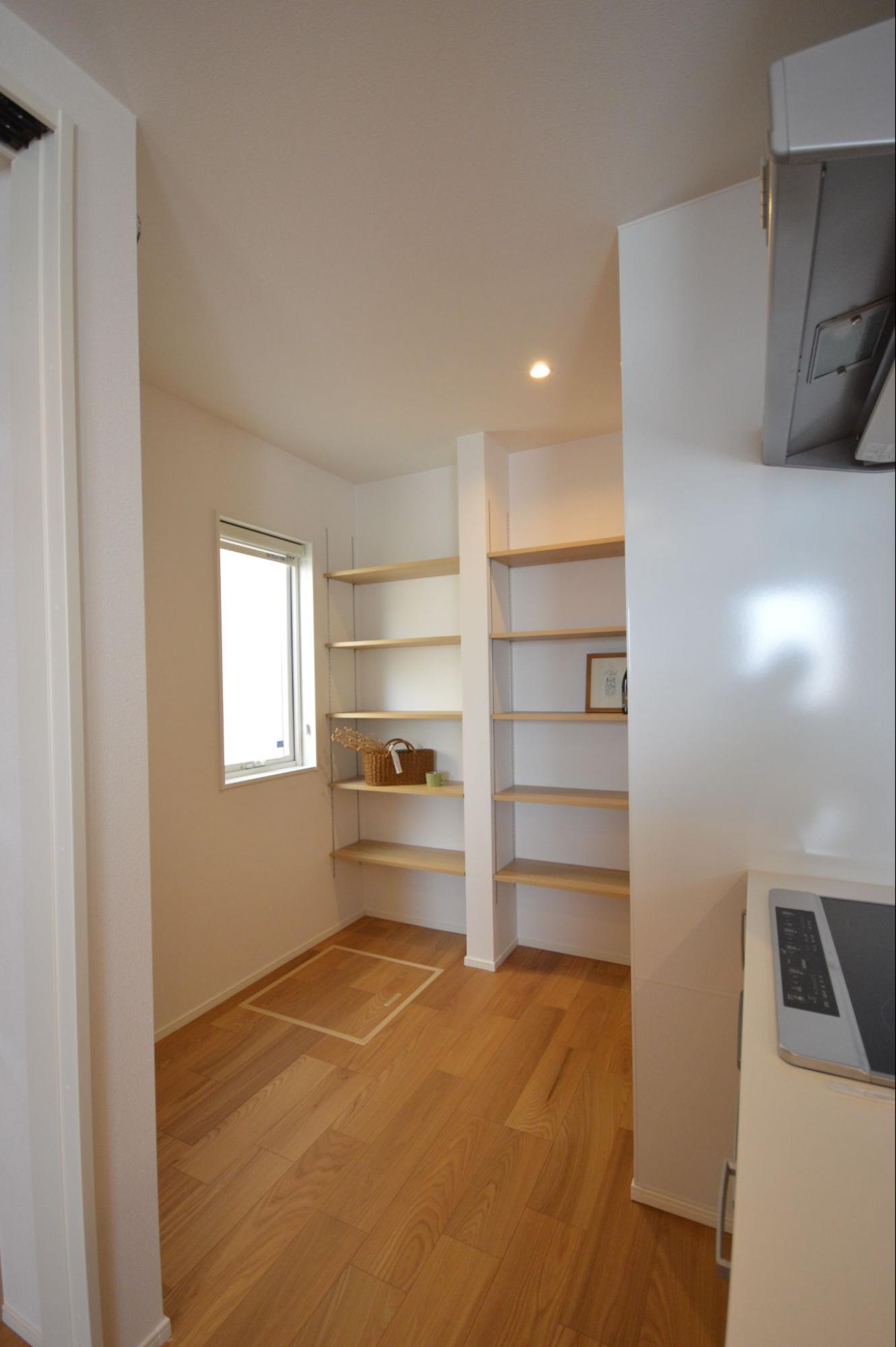 パントリーは、食品や調理器具などを収納する、キッチン専用の収納スペースです。食品はもちろん、食器、調理器具、日用品、非常食や水など、様々なものを収納できます。キッチン周りをすっきりさせ、調理スペースを広く確保できる点も魅力です。