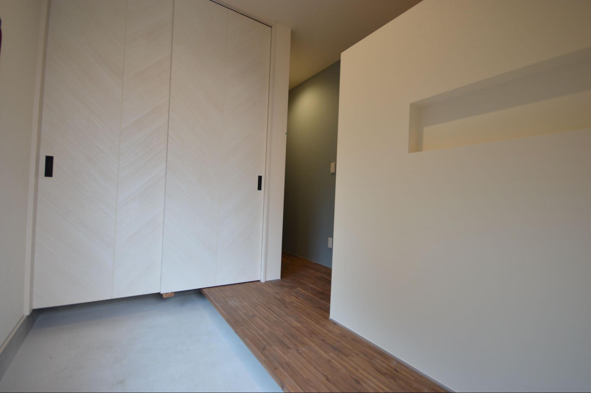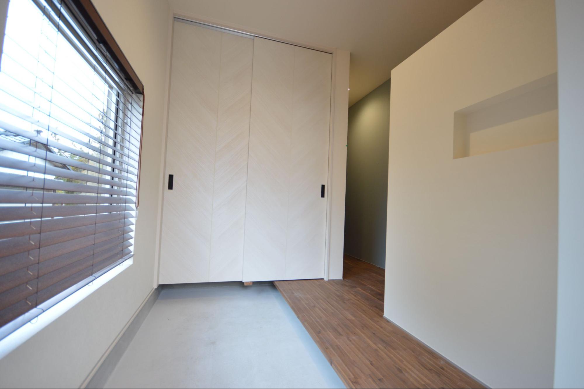 こちらは玄関にシューズクロークを付けずに、壁面収納を設置することで、広々とした空間と豊富な収納力を両立した事例です。