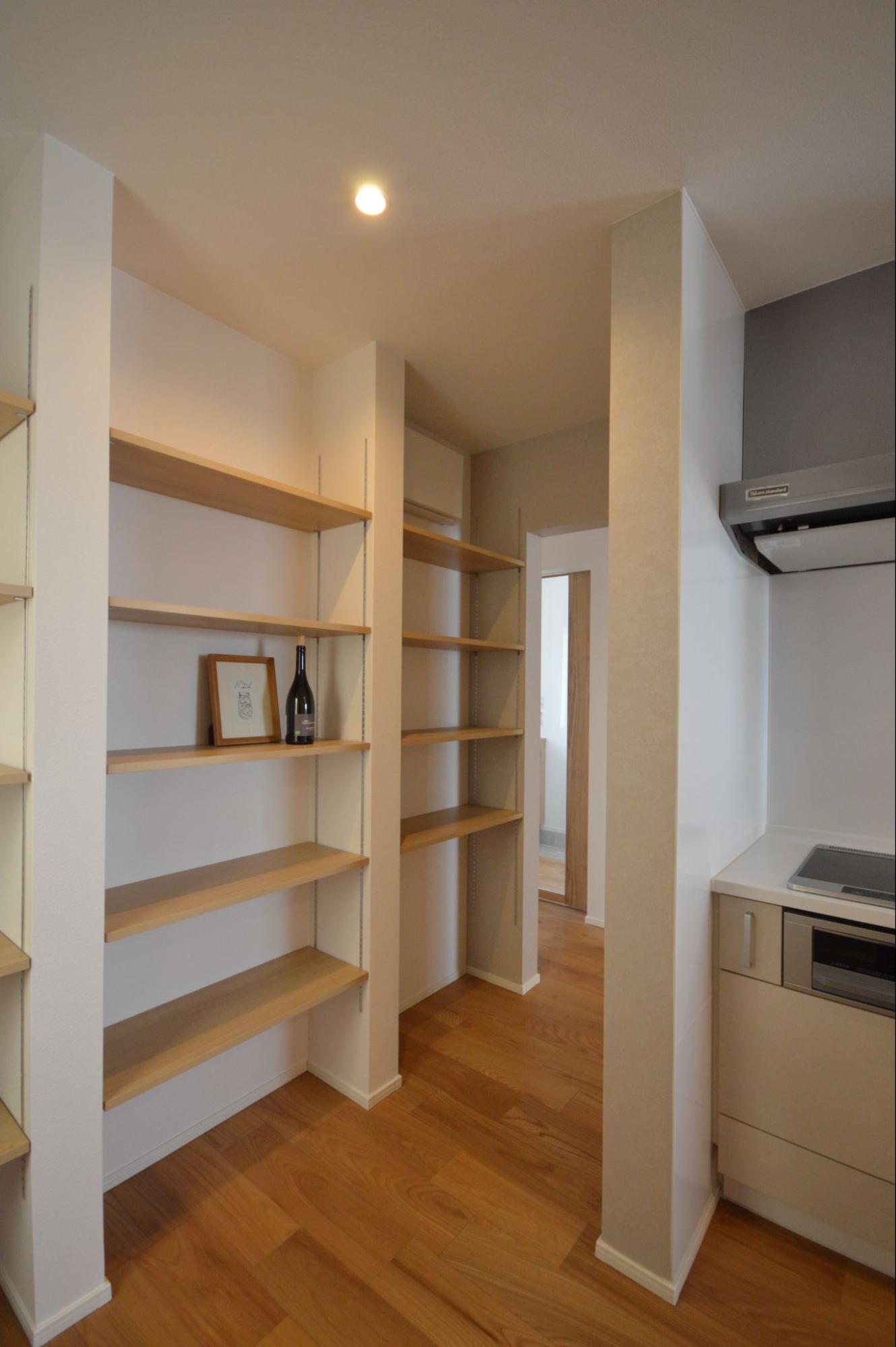 こちらの事例は壁面収納型のパントリーです。キッチンのすぐ近くにあり、家事動線にも考慮されています。