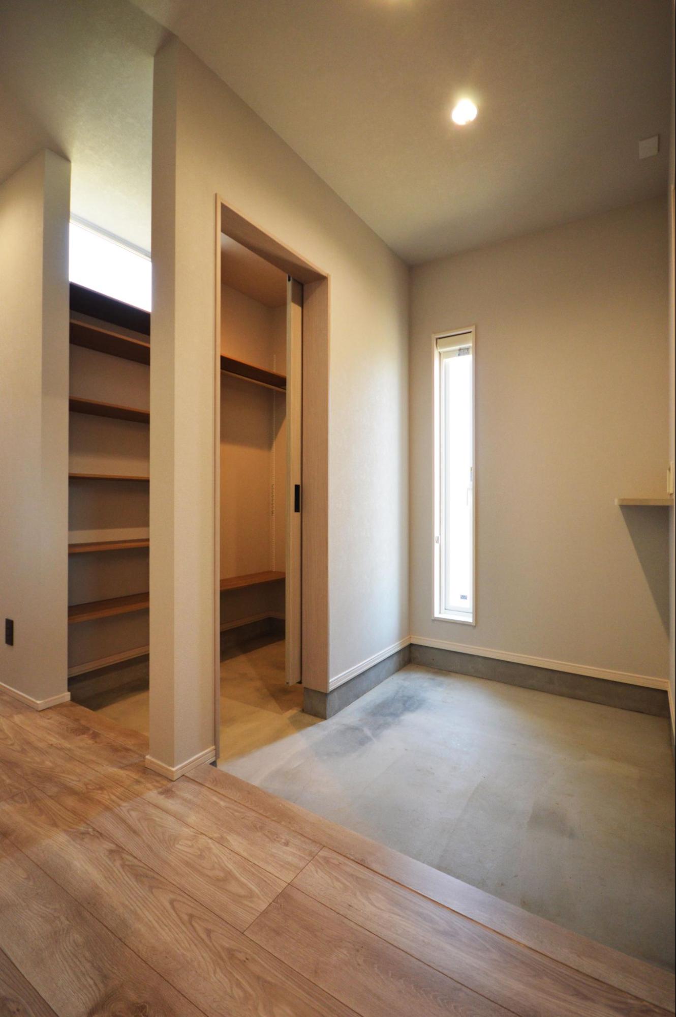 従来のシューズクロークと異なり、壁一面を収納スペースに。靴はもちろん、アウトドアグッズや季節用品など、様々なものが収納可能です。