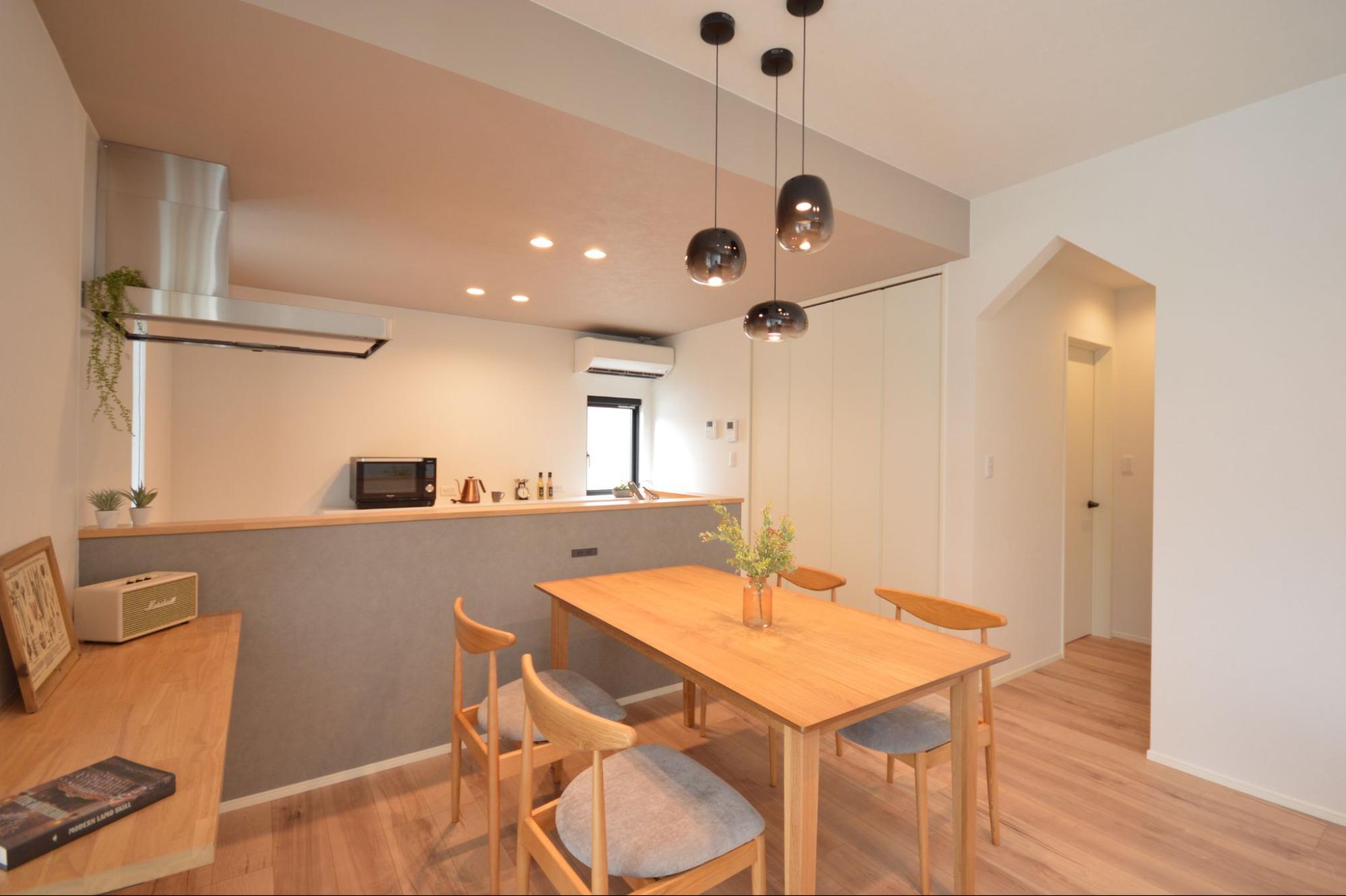 壁紙やダイニングの照明器具などにも、モダンな要素を取り入れて、洗練された印象をプラス。ナチュラルとモダンの絶妙なバランスが魅力の、家族みんなが笑顔で過ごせる理想の住まいとなっています。