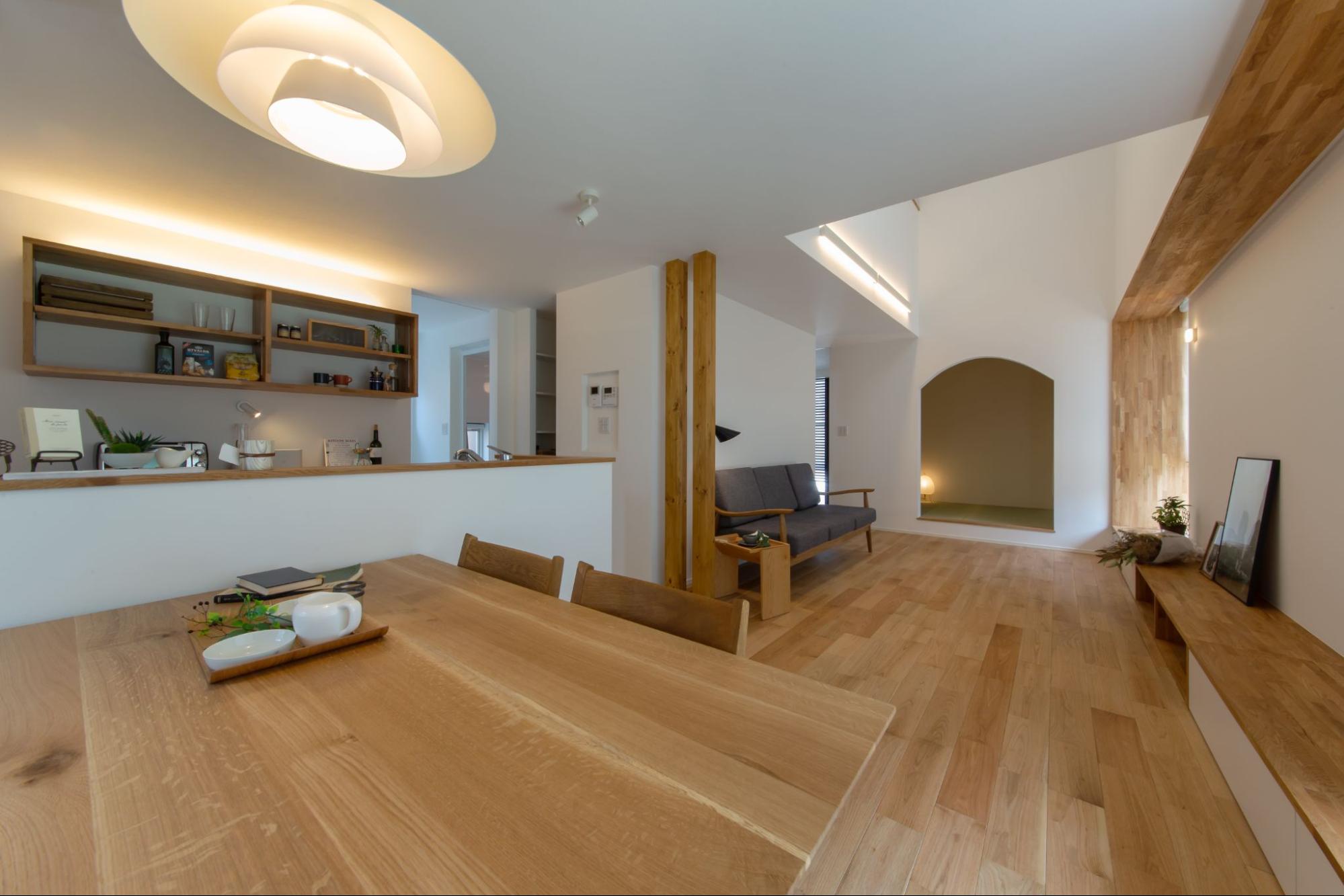 天井にも無垢材を取り入れると、より一層ナチュラルな雰囲気に。天井を板張りにすると、空間全体に温かみが感じられます。梁を見せるデザインを取り入れた場合は、空間全体に立体感が生まれて、より個性的な空間に仕上がるでしょう。