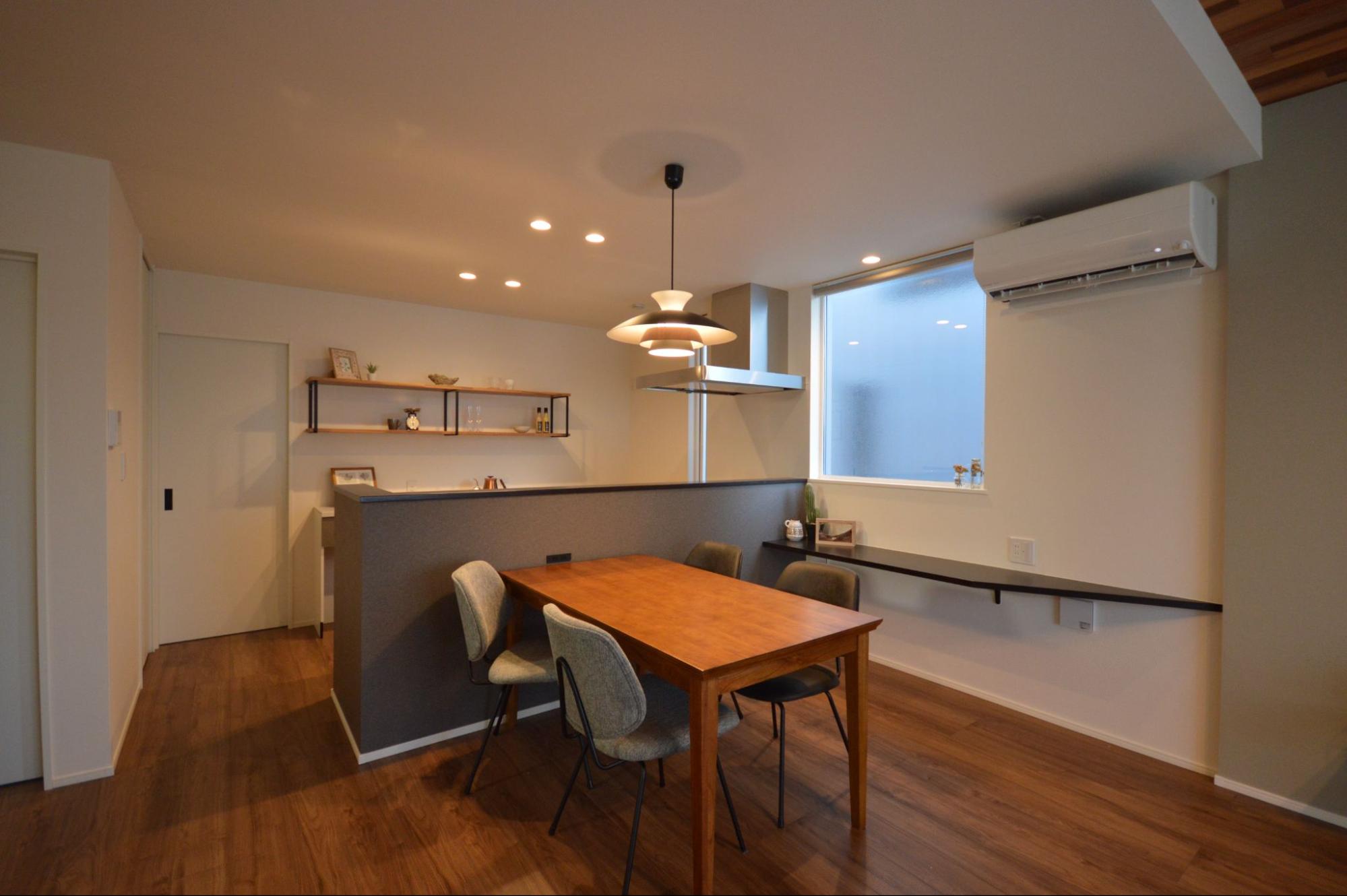 キッチンとダイニング・リビングは横並びの配置とし、吹き抜けを取り入れることで、空間に広がりを感じさせています。作業台は壁向きですが、リビングやダイニングとの行き来がスムーズにできる設計で、家族とのコミュニケーションを大切にする工夫が施されています。