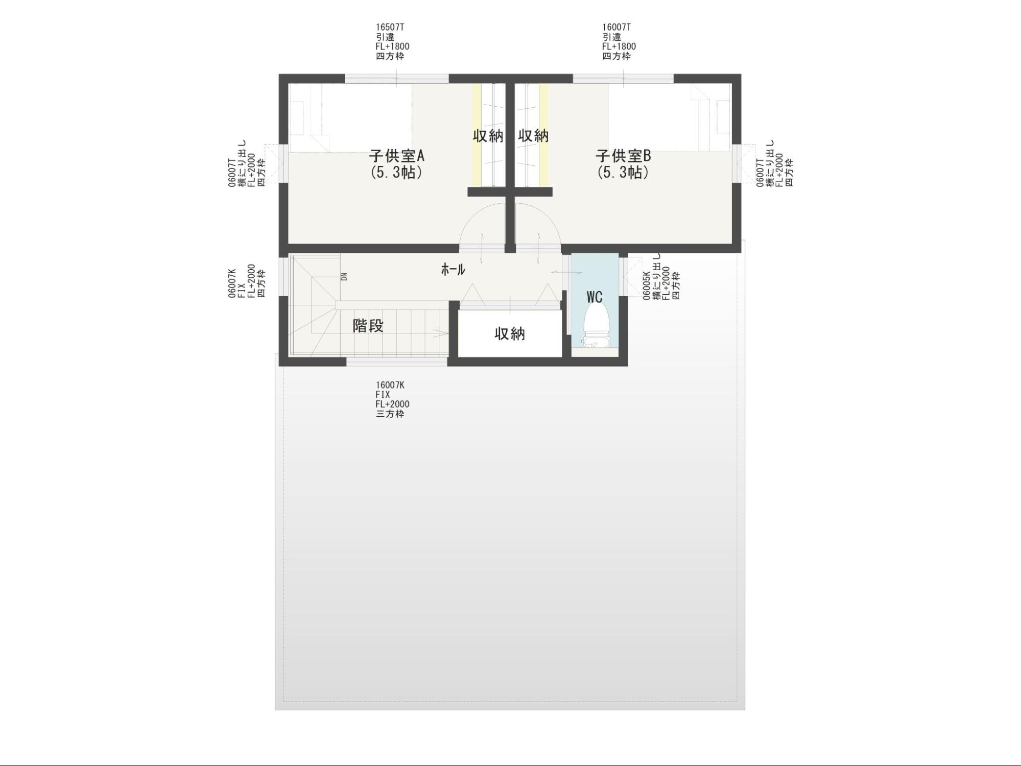 水回りは回遊動線で効率的に配置され、ランドリーから脱衣室への動線もスムーズ。2階には各居室をしっかりと設け、子供室には収納とスタディーカウンターが一体化した機能的なスペースが用意されています。