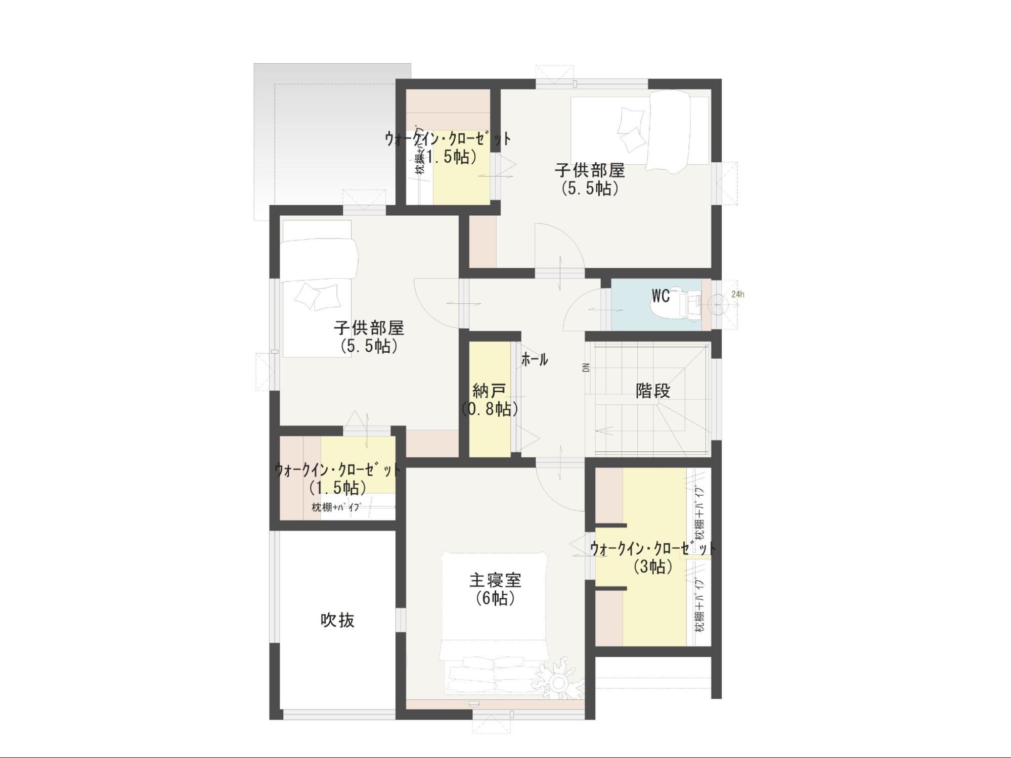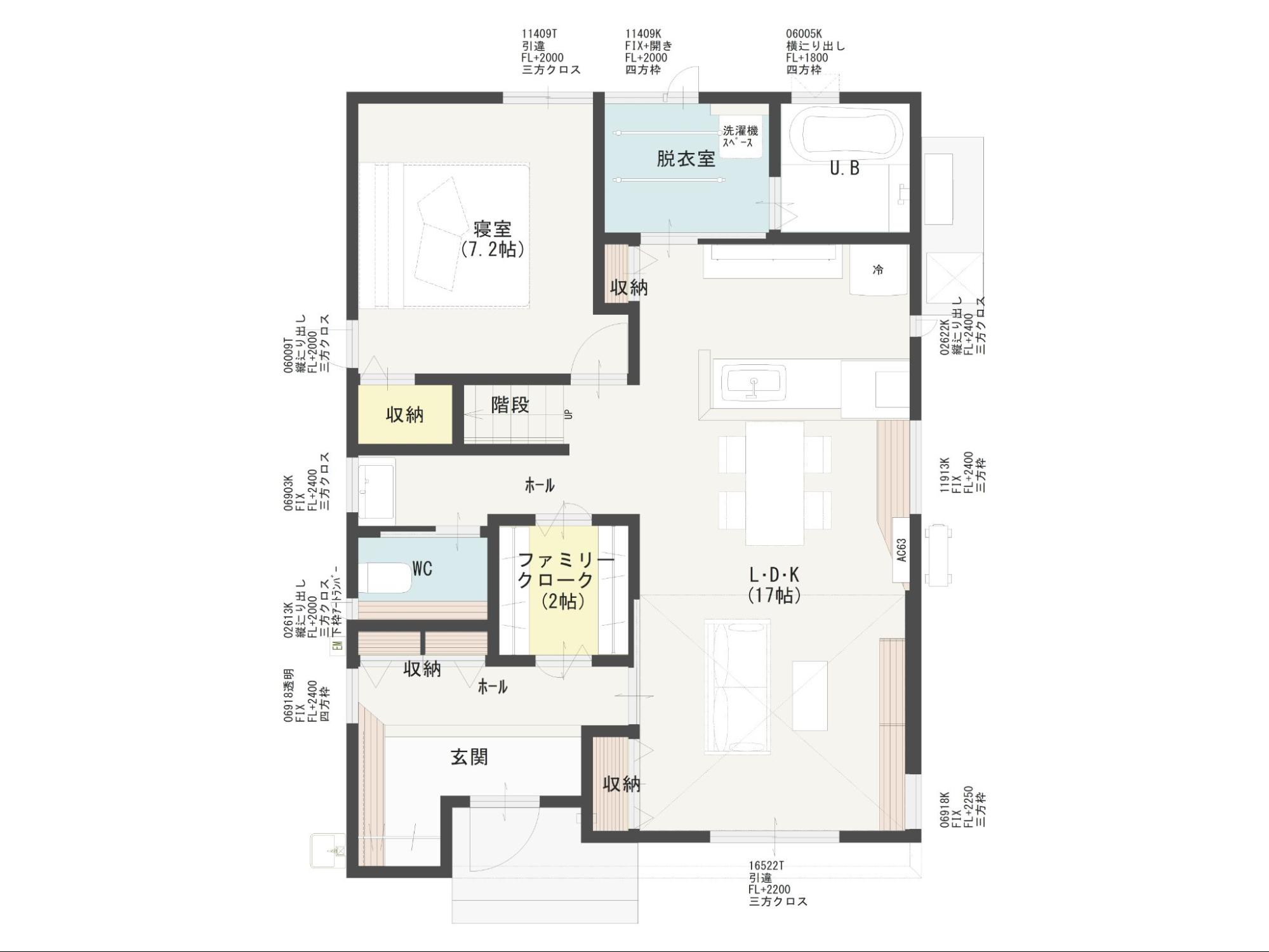 こちらの注文住宅の施工事例では、3LDKのスタンダードな間取りに吹き抜けや回遊動線、ファミリークロークなどの工夫を加え、快適で機能的な住まいを実現しています。