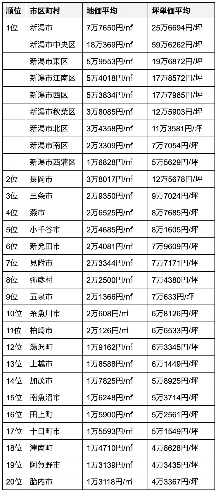 (出典:新潟県の土地価格相場・公示地価・基準地価マップ・坪単価ランキング|2025年[令和7年]|土地代データ)