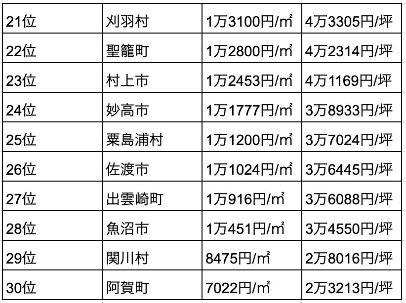 - 30位 阿賀町(7022円/m²・2万3213円/坪)