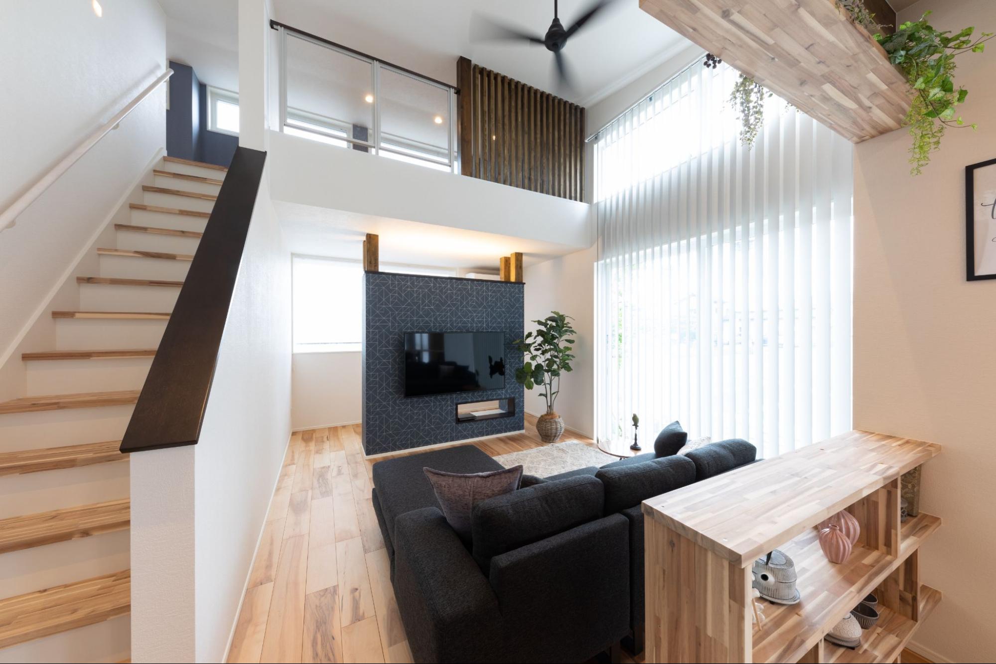 こちらは、勾配天井とロフトを設置した事例。モダンでおしゃれな雰囲気があり、開放的なLDKとなっています。