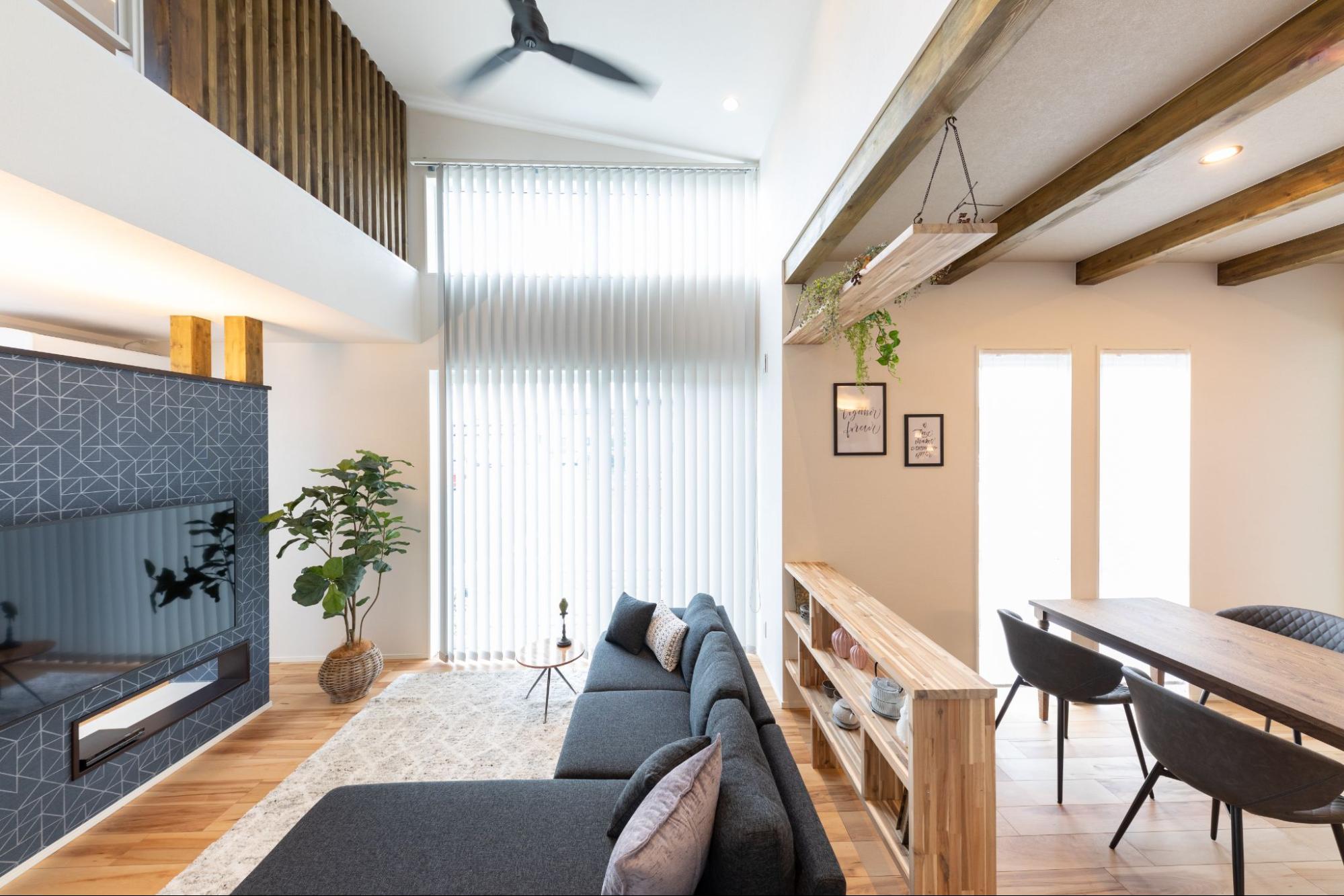 事例02:勾配天井が叶える、光と広がりのあるリビング