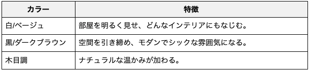 さらに、カラー選びも、部屋全体の印象を左右します。