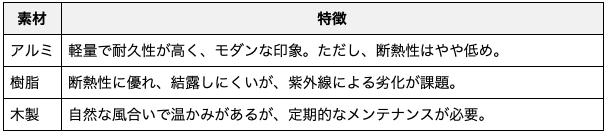 掃き出し窓のフレーム素材やカラーは多種多様です。素材ごとに特徴が異なるため、用途やデザインに合わせて選びましょう。