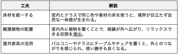 このようなアイデアを活用することで、窓を開けると室内と屋外との一体感を感じる、心地よい空間が完成します。