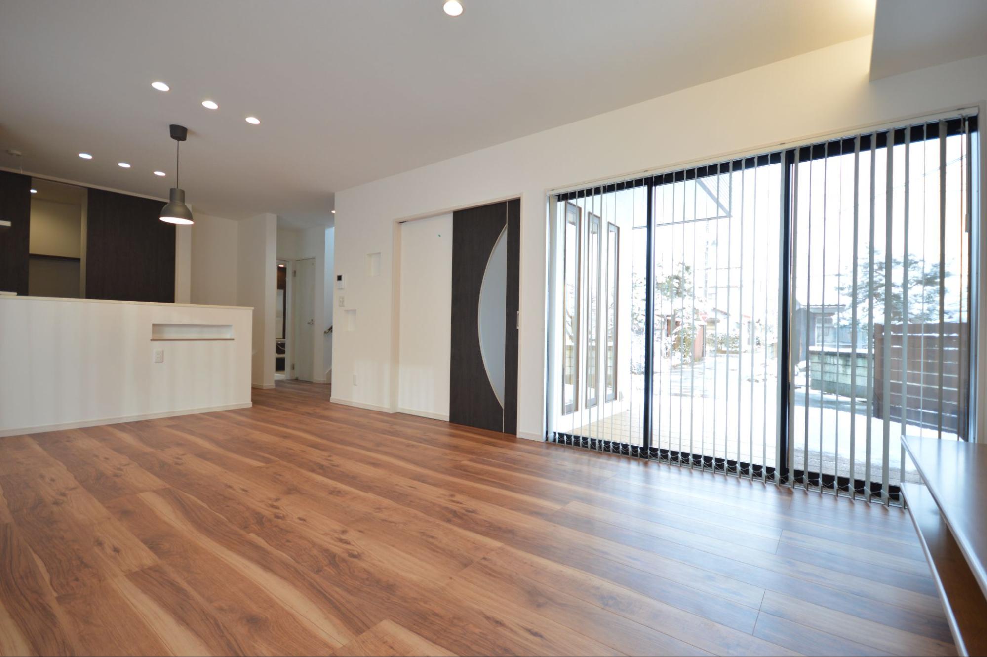 こちらは、大開口サッシとFIX窓(開閉できない窓)で光あふれる住まいの事例。幅が最大サイズの窓は、開放感を生むだけでなく、大きな家具もスムーズに搬入できる実用性も魅力です。さらに、FIX窓を並べることで、部屋全体が自然光に包まれ、心地よい明るさと開放的な空間になっています。