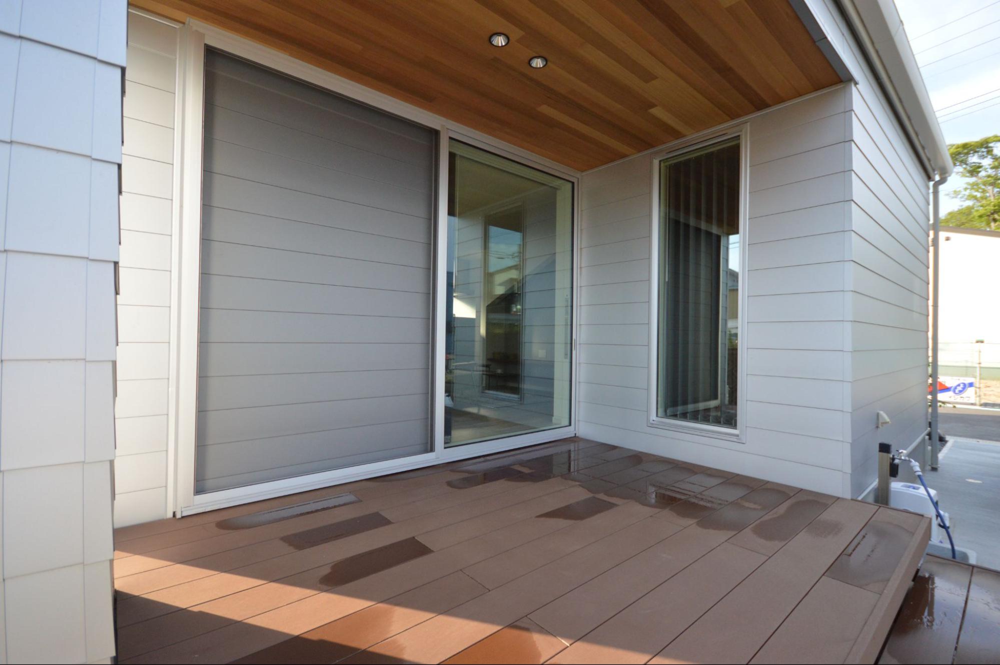 こちらは、大開口スライディング窓で開放感を追求した住まいの事例です。3枚建ての大きな窓がフラットレールで滑らかに開閉し、ウッドデッキまで段差なくつながります。
