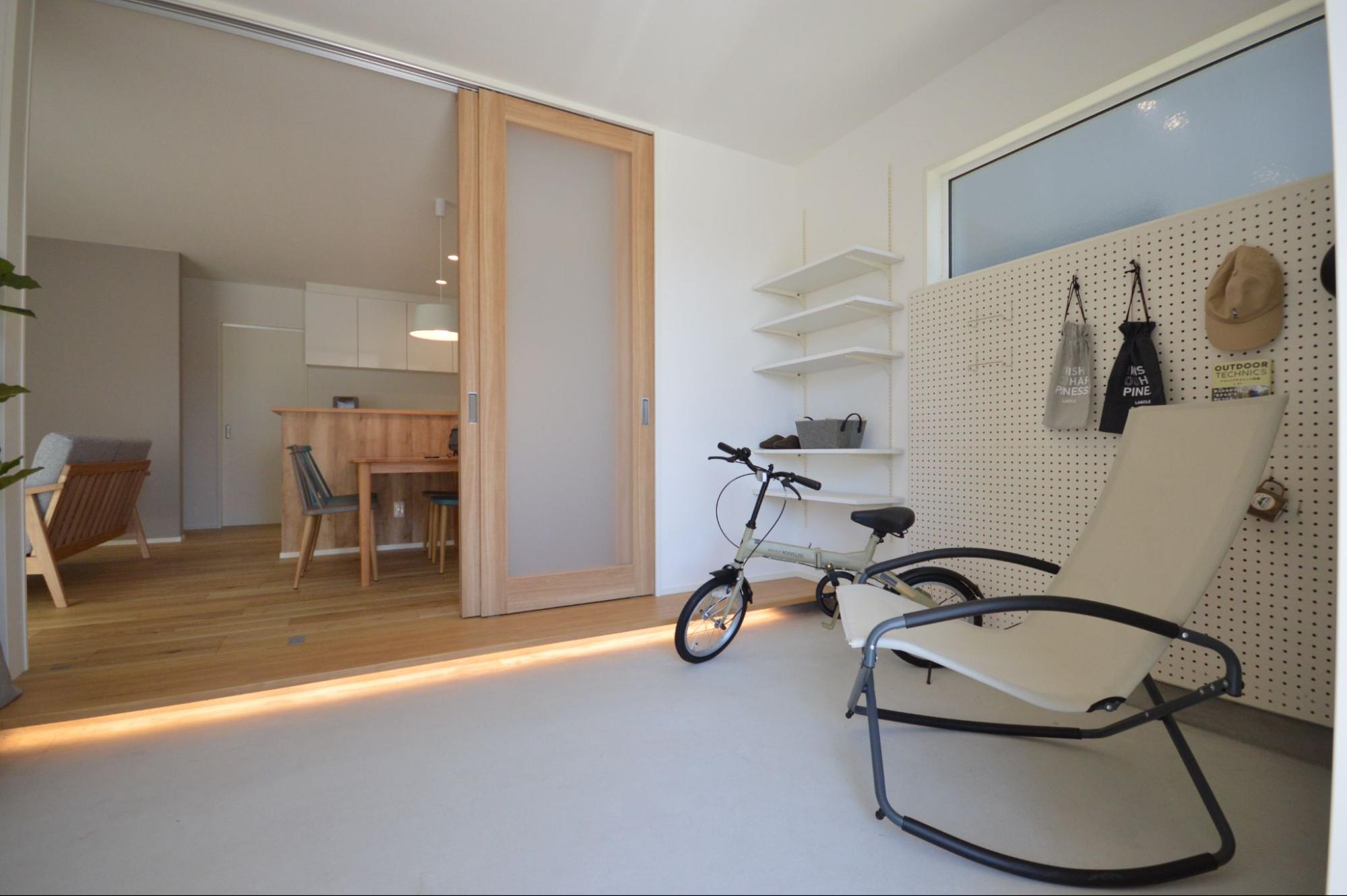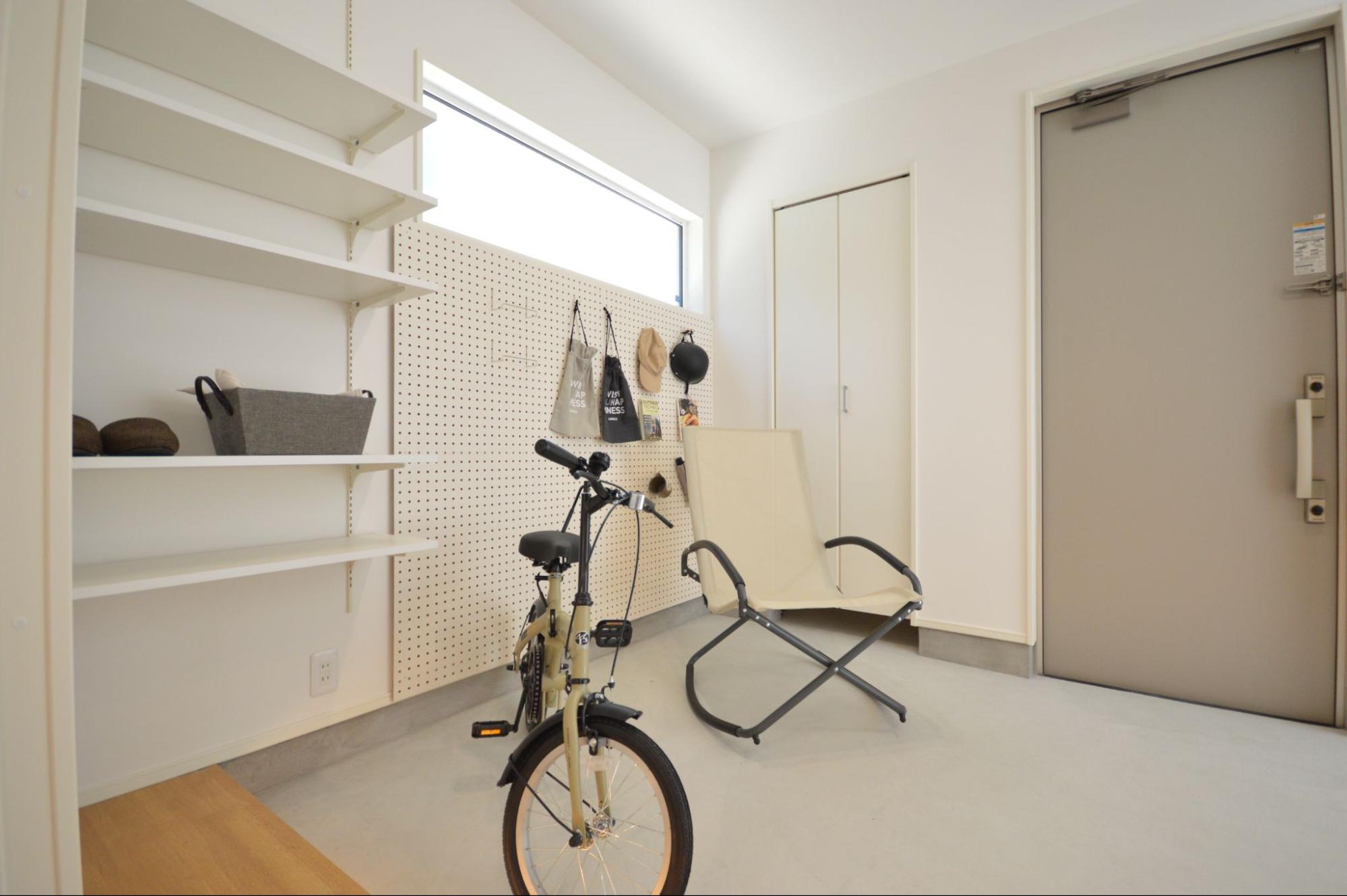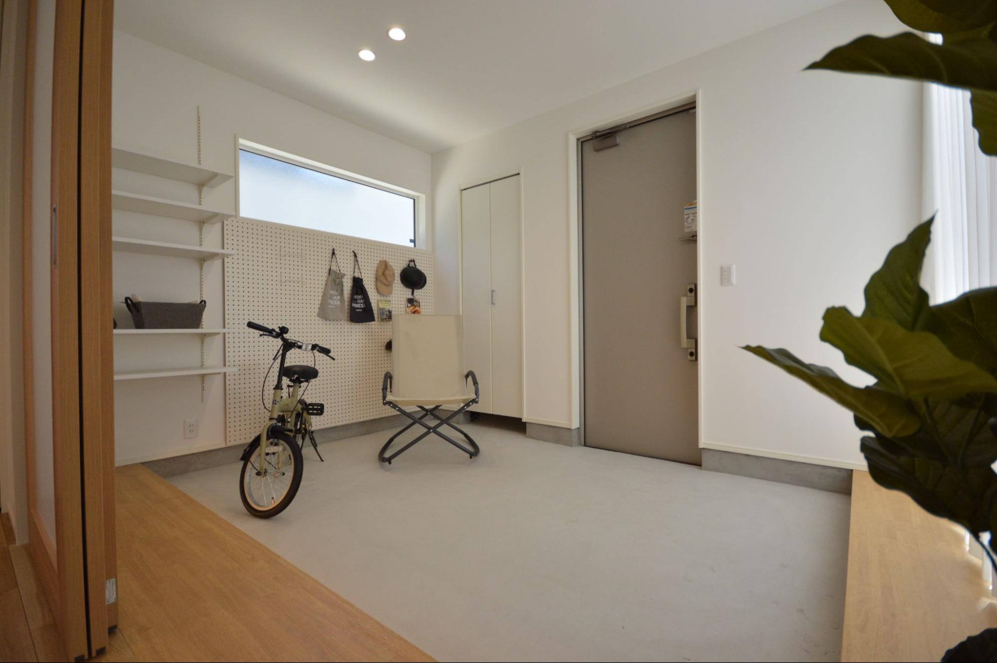 靴や自転車を置くだけでなく、雨の日のちょっとした物干しスペースとしても使えます。汚れを気にせず作業ができるため、何かと便利な空間です。