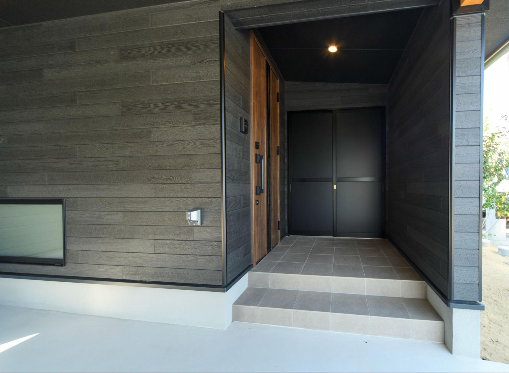 建物の外観は、黒が基調のシックなデザインです。植栽の緑を組み合わせることで、柔らかく自然に調和しています。片流れ屋根の軒が印象的な水平ラインを作り、和モダンな雰囲気がより際立っています。