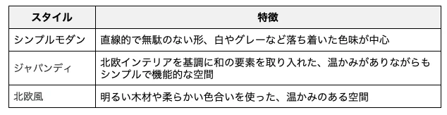 デザイン性の高い住宅の中でも代表的なテイストは、シンプルモダンやジャパンディ、北欧風などです。以下に、代表的なデザインスタイルの特徴をまとめました。