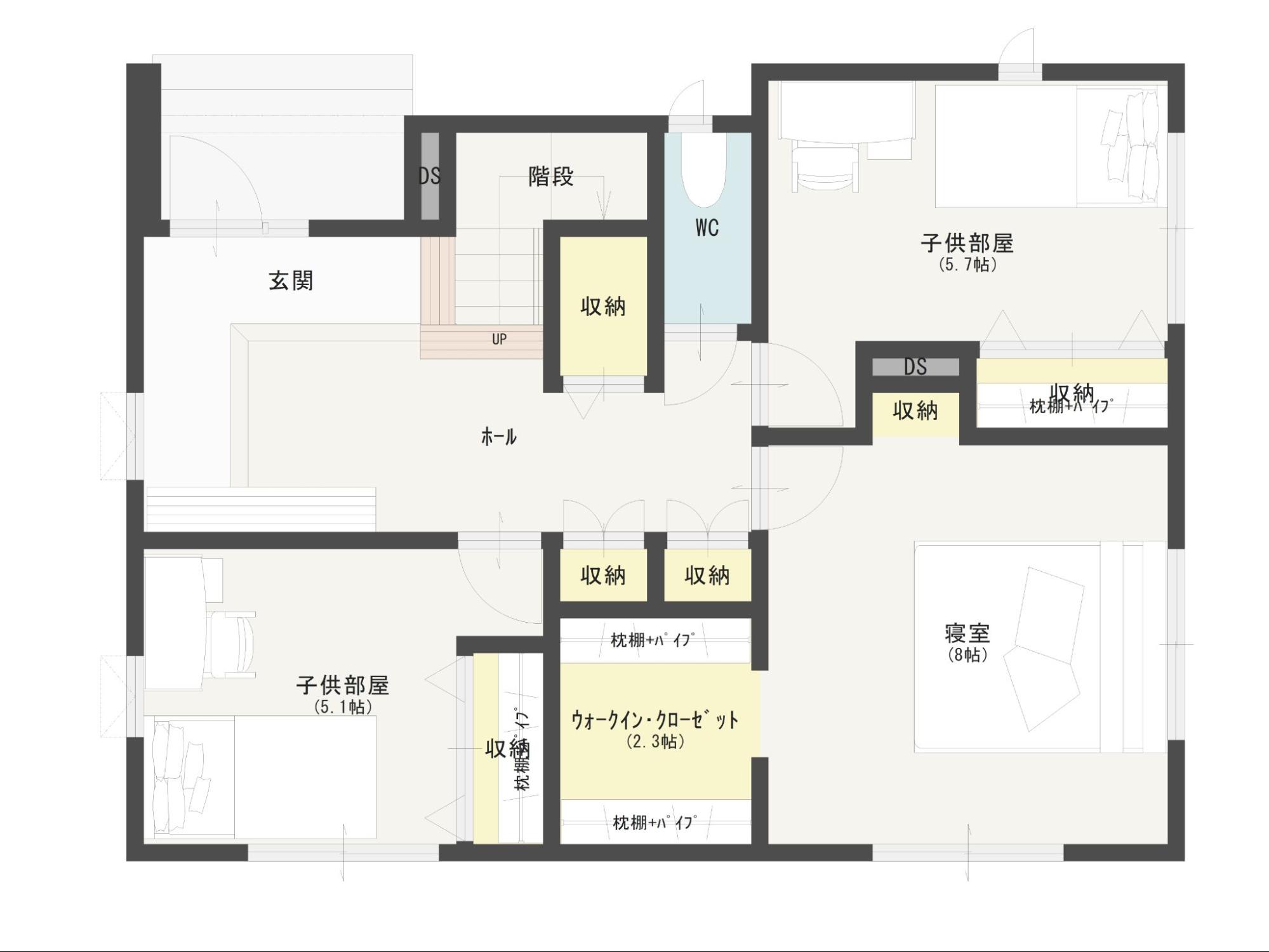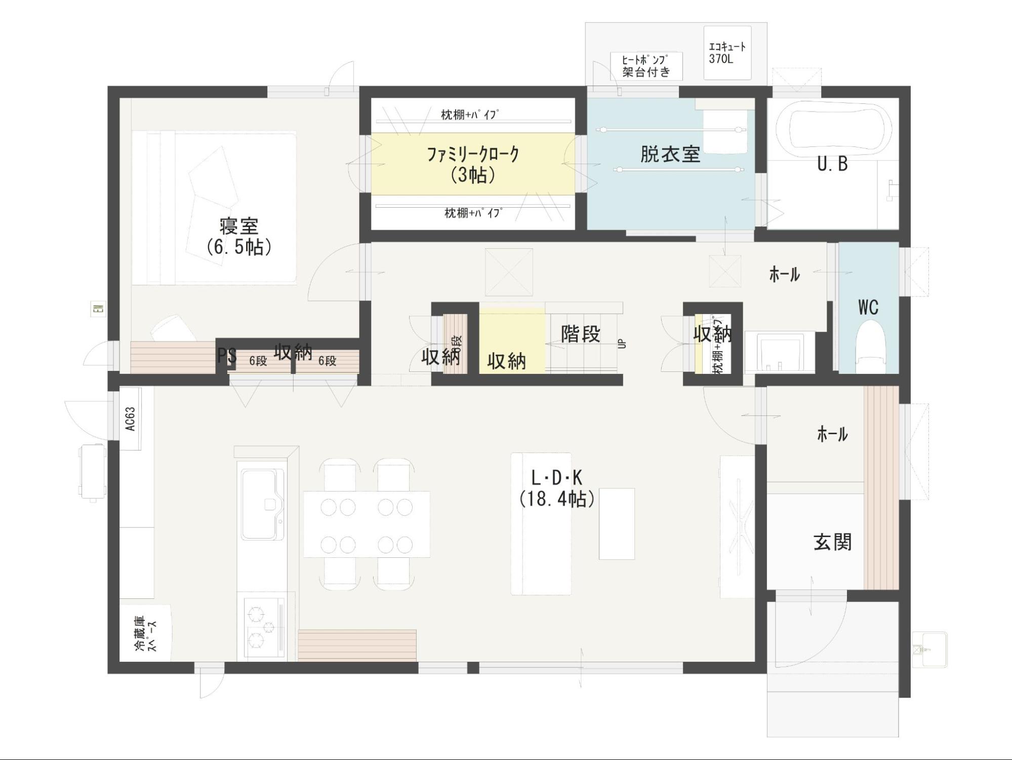 1階に寝室を設けることで、子育て期から老後まで生活の中心を1階で完結できる間取りとなっています。