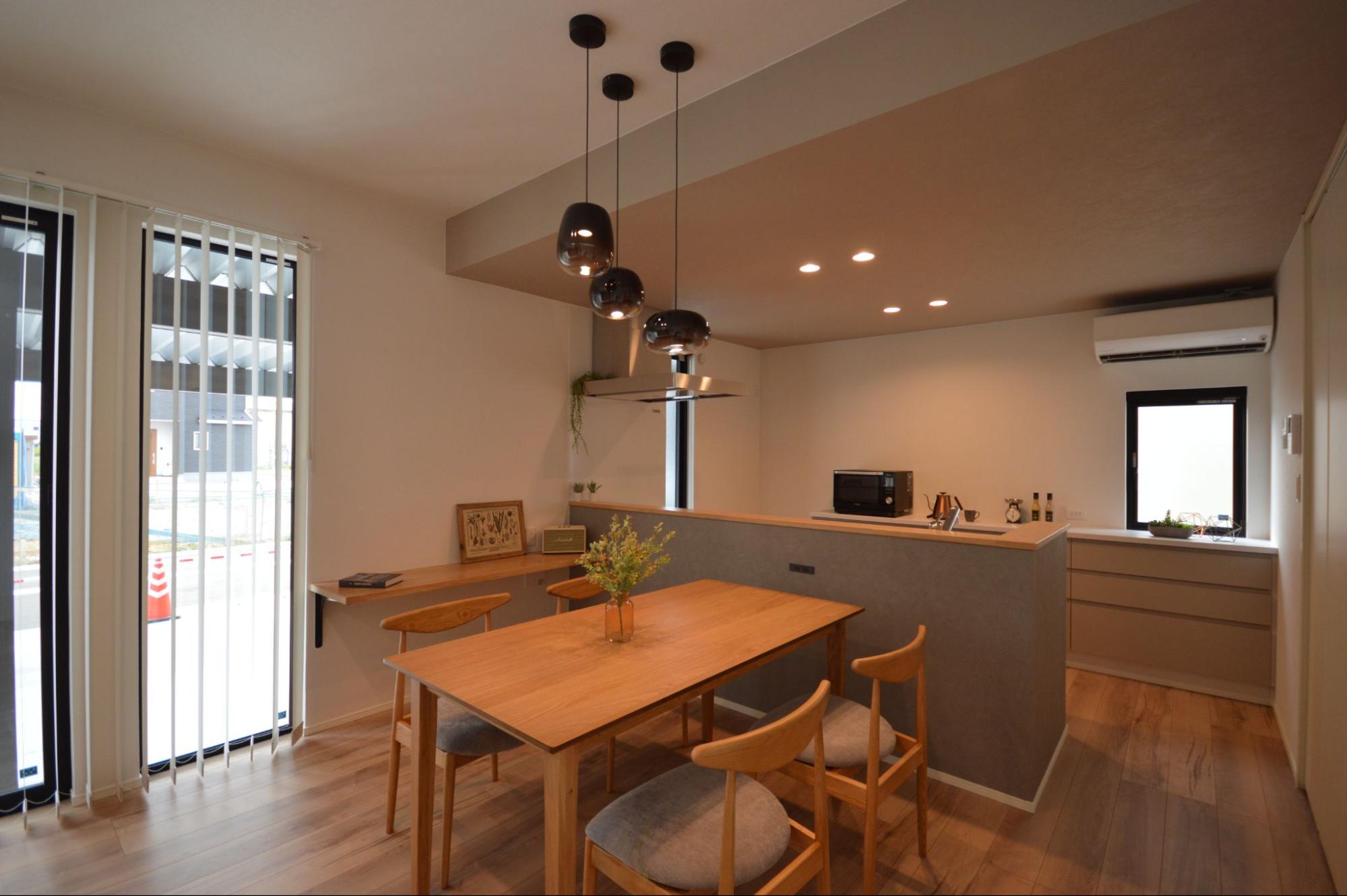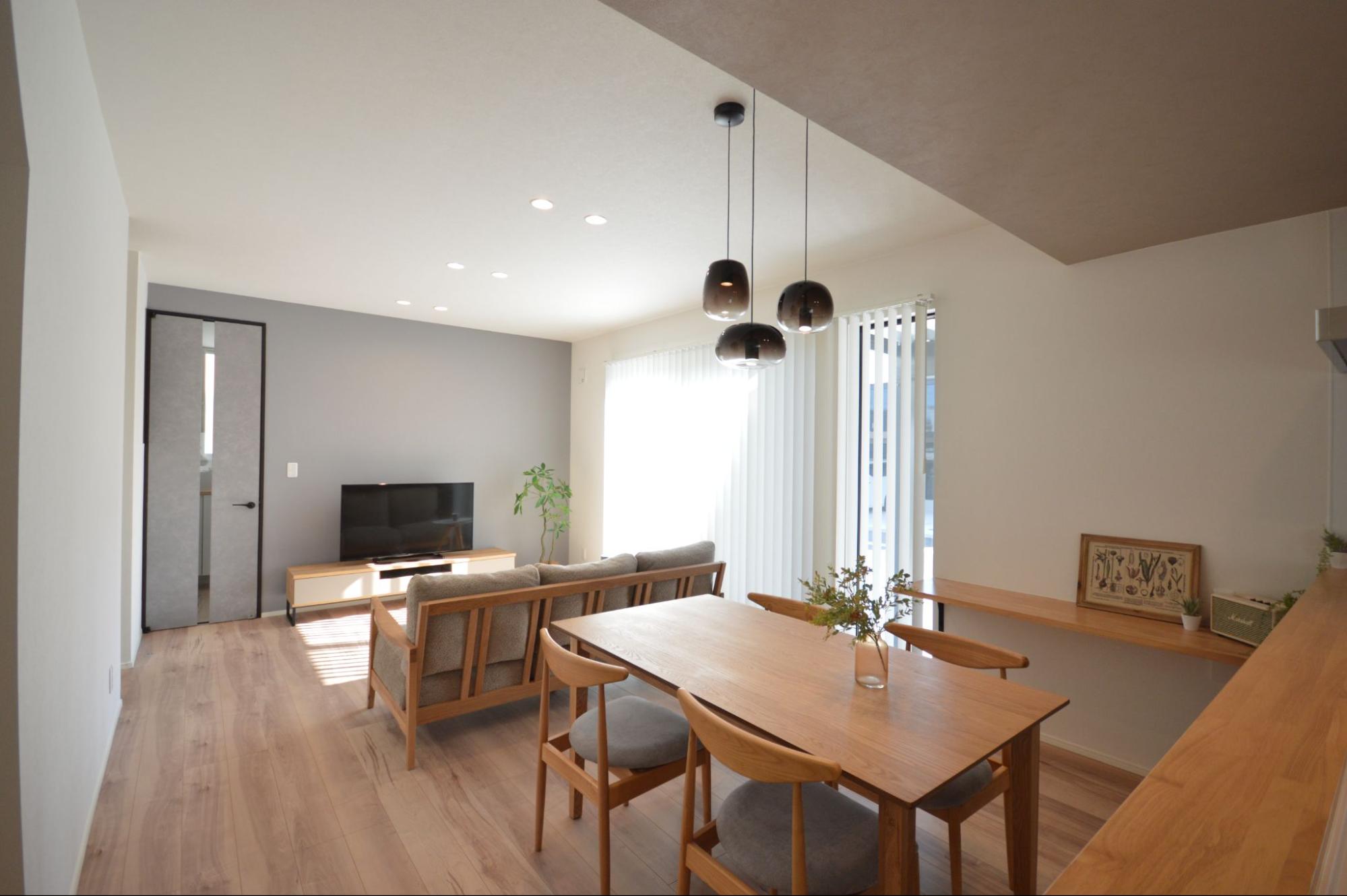 リビングとダイニングは天井高2.6mの開放感ある空間に仕上げられ、ダイニングの照明が美しいアクセントに。