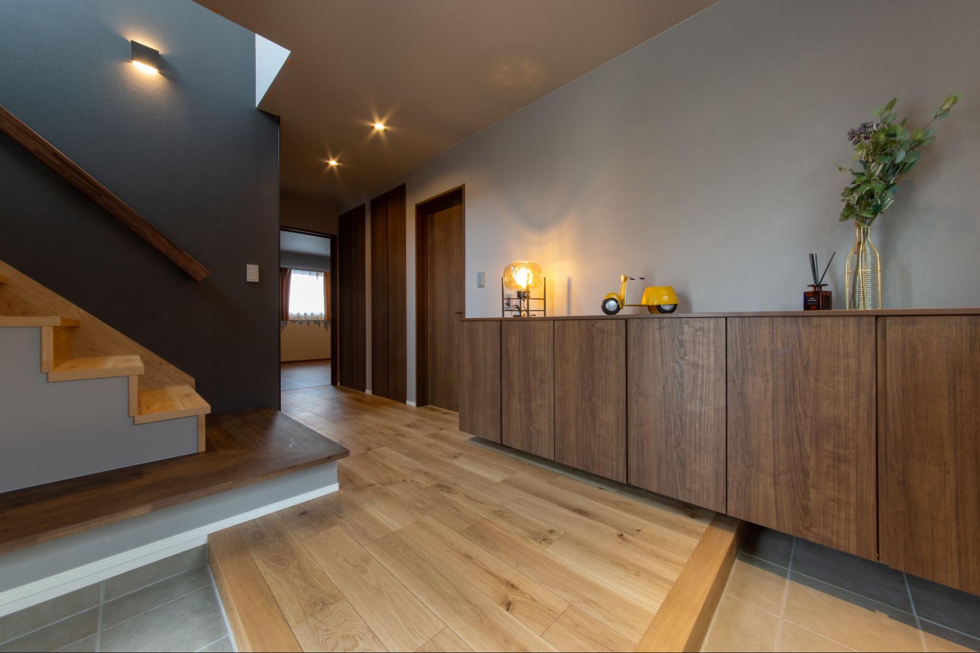 玄関ホールでは階段そのものがデザインの一部として活かされており、家全体に統一感とセンスを感じさせるつくり。機能性と美しさが調和した、洗練された住まいです。