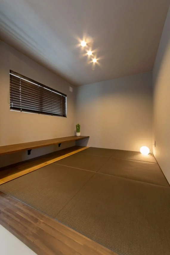 落ち着いた色合いでまとめられたインテリアは、上質な雰囲気を演出。リビングとつながるシックな和室にはスタディカウンターも設置され、家族がくつろいだり学んだりできる多目的な空間となっています。