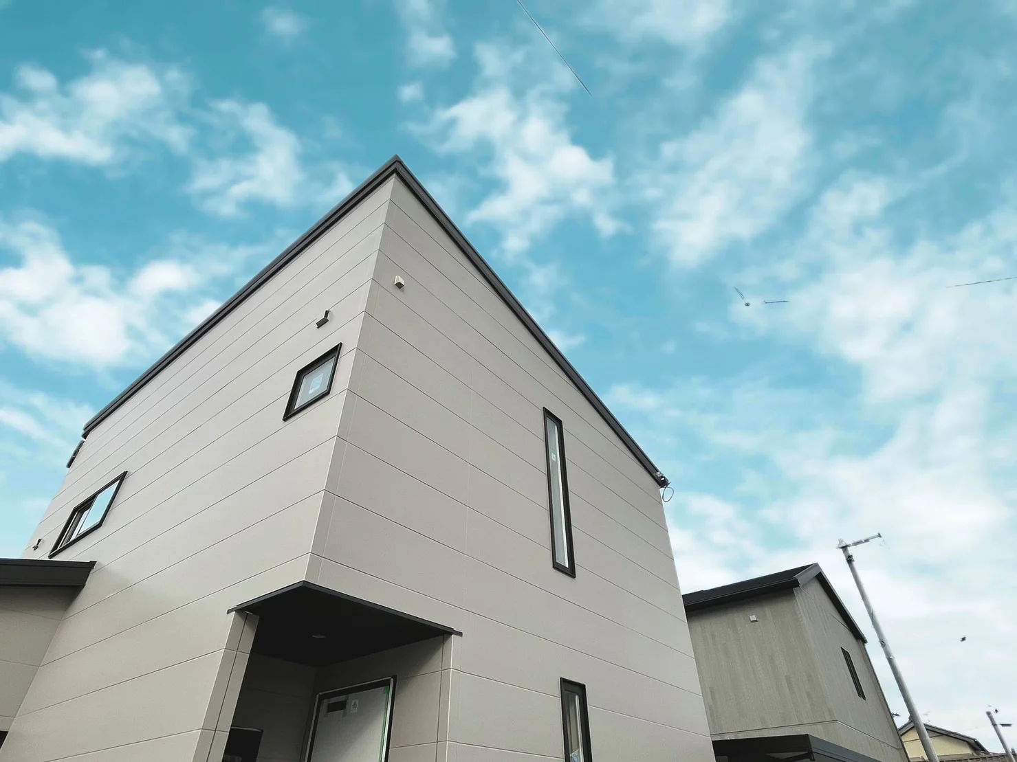 外観はグレーのフラットな壁が特徴で、トレンド感を演出しています。ZEHレベルの断熱性能も備え、心地良い暖かさを保つ快適な住まいです。