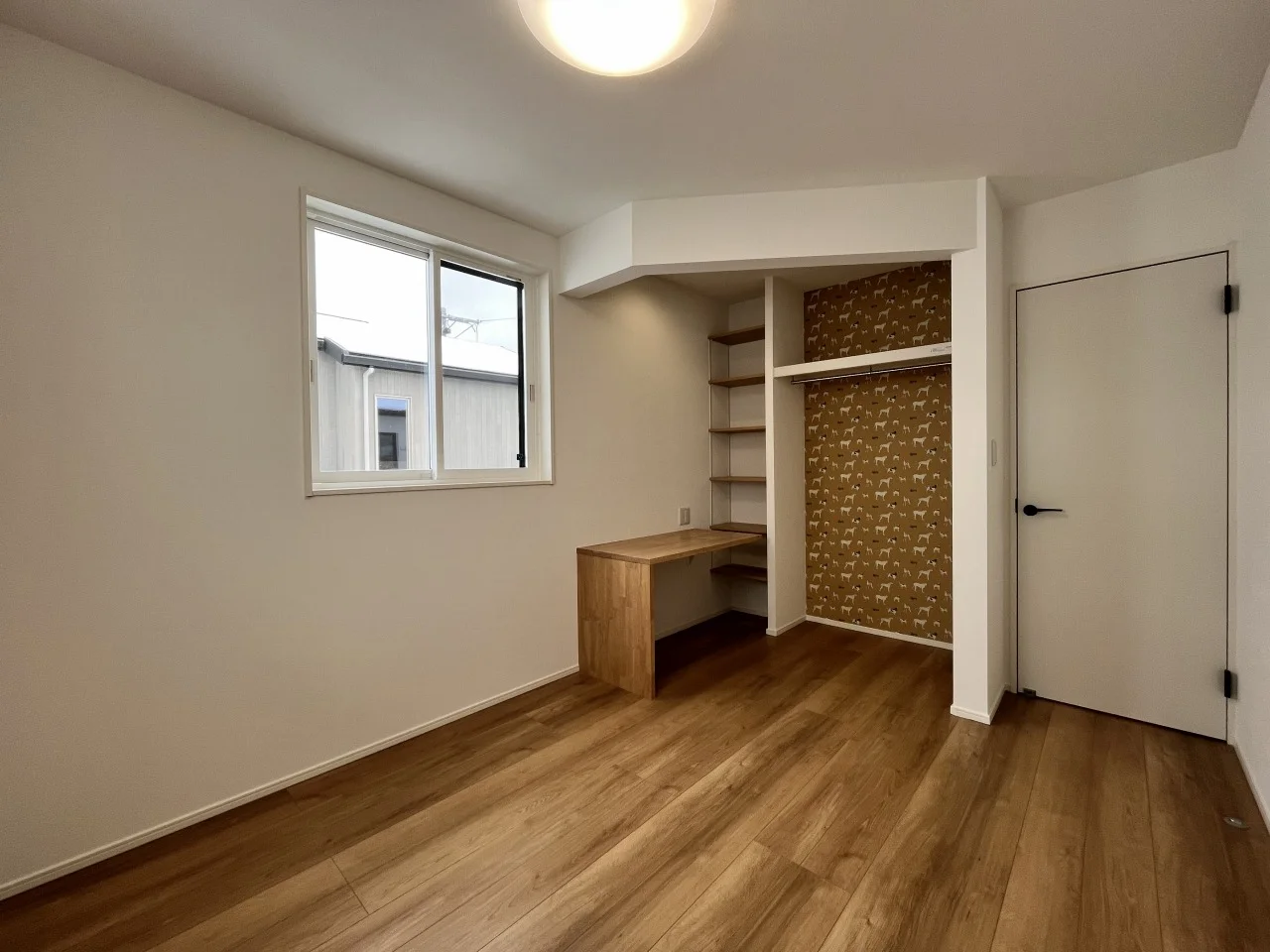 子供室には収納とスタディデスクを一体化したスペースを設け、省スペースでも機能性を確保。
