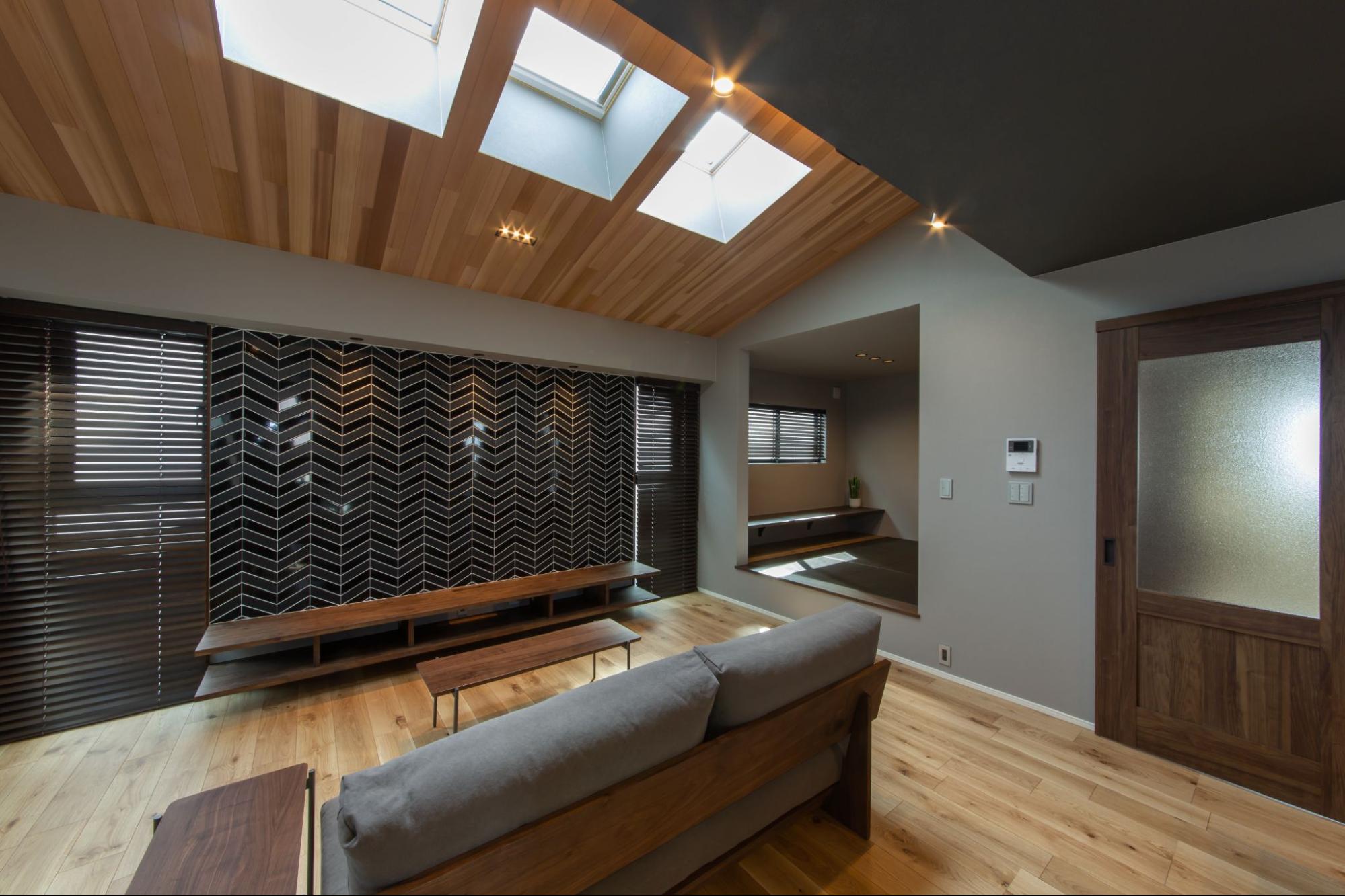 勾配天井と天窓によって、空から自然光がたっぷり差し込み、明るく心地良いリビング空間が広がります。
